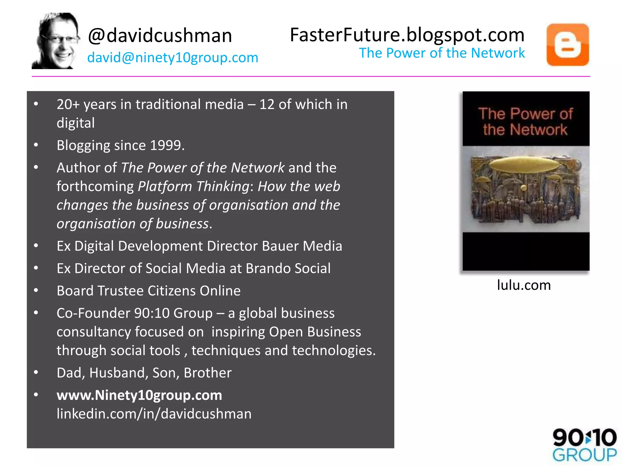 The document discusses how the web and technologies like 3D printing are changing business and organization. It argues that the future will be more self-organized, with people coming together in groups to solve problems and create solutions. The role of organizations will be to act as platforms that bring people together and help discover collective solutions, rather than being the direct makers of products. It suggests organizations transition to platform thinking by becoming more open and focusing on understanding shared purposes to support and empower groups of people seeking to create positive change.