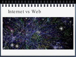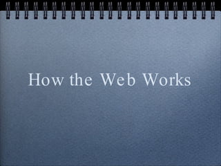 The document provides an overview of how the web works, including definitions and explanations of key concepts like servers, clients, protocols, URLs, HTML, and considerations for diversity and accessibility on the web. It then walks through steps to create a simple web page for a restaurant website, including adding basic document structure and text elements, an image, and basic styling with CSS.