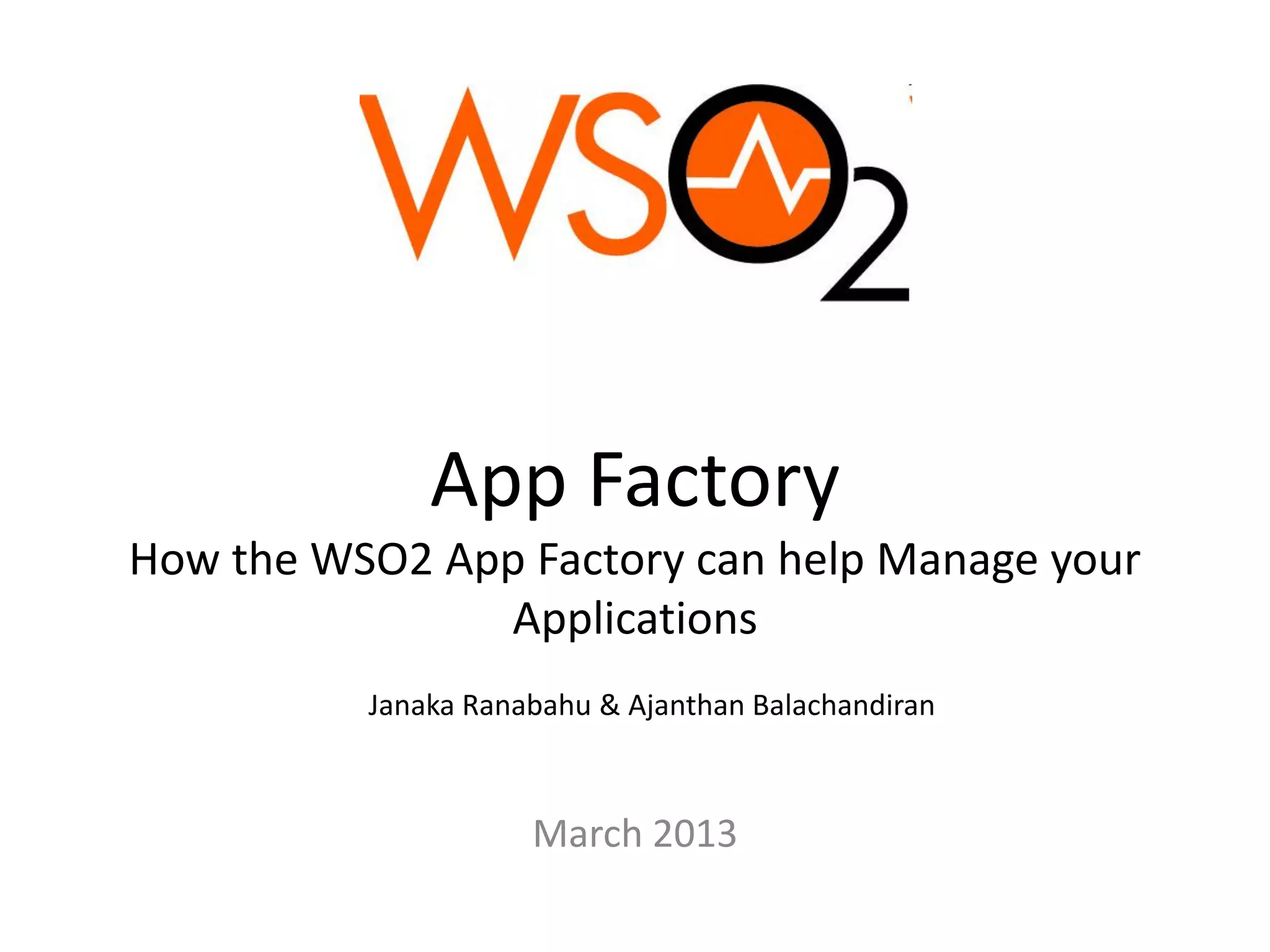 The document discusses the WSO2 App Factory, which is a platform for managed application development. It provides automated configurable DevOps and governance processes to support applications throughout their lifecycle from development to production. Key features include facilitating regulatory compliance, providing a configurable governance model, integrated developer tools, dependency management across environments, and extensibility. The App Factory integrates with other WSO2 products like the API Manager.