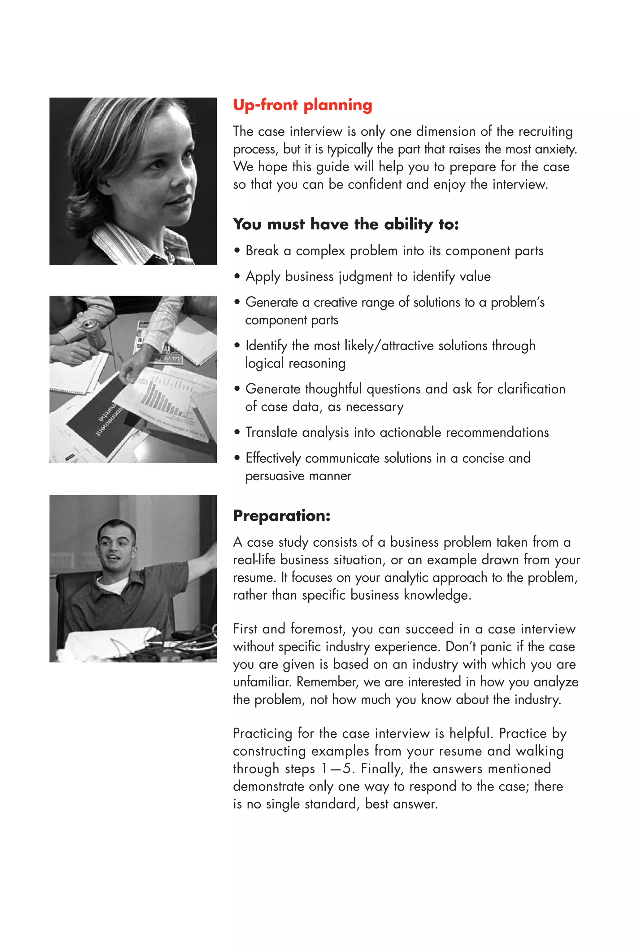 The document provides guidance on how to prepare for and succeed in a case interview for Bain & Company. It outlines the key abilities needed to analyze business problems, such as breaking problems into parts and generating solutions. It emphasizes that the interview focuses on analytic abilities rather than industry knowledge. The summary also previews the typical structure of the case interview, which involves identifying issues, analyzing problems logically, focusing on value, demonstrating business intuition, and orienting solutions toward results.