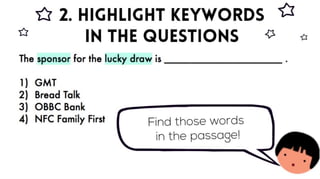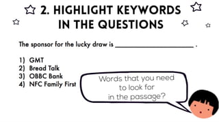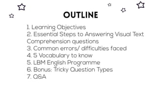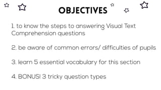 The visual text comprehension component takes up 8 marks in Booklet A of Paper 2 and is an area which some children will describe as a piece of cake! After all, it is a multiple choice question section, it should be simple, right? Why is it that children are not able to score full marks then? Let us find out whether your child is making some common errors that are preventing them from scoring and the steps that they can take to clinch those 8 marks! On the live webinar, you will learn... 1. the steps to answering Visual Text Comprehension questions 2. to be aware of common errors/ difficulties of pupils 3. 5 essential vocabulary for this section 4. BONUS! 3 tricky question types Who is this webinar for? You will be interested to join us 1. If you are a parent who is looking to guide your children at home or 2. If you are a primary school *student looking to score well for your Grammar MCQ * We strongly encourage parents to accompany their children in attending our webinars so that parents can provide technical support as well as to take advantage of any promotions that we may run during the webinar. Duration of the webinar : 45 mins ~ 60 mins