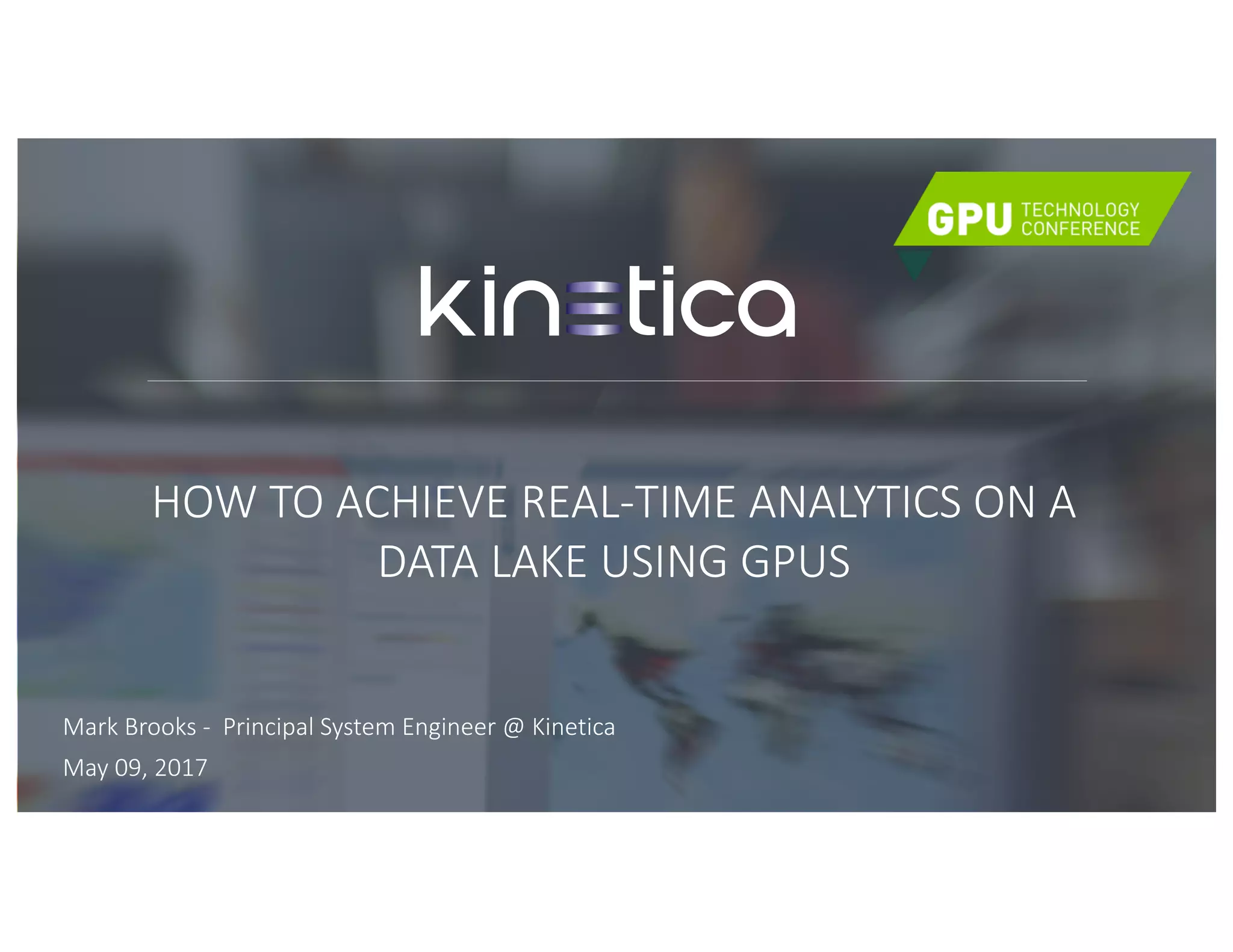 The document discusses methods for achieving real-time analytics on data lakes using GPUs, addressing challenges such as large data volumes and minimal latency. It presents various architectural approaches, including lambda and kappa architectures, and highlights the advantages of GPU-accelerated databases like Kinetica for processing and analyzing big data efficiently. Additionally, it includes use cases in logistics and financial sectors, showcasing the performance benefits of rapid data ingestion and analytics capabilities.