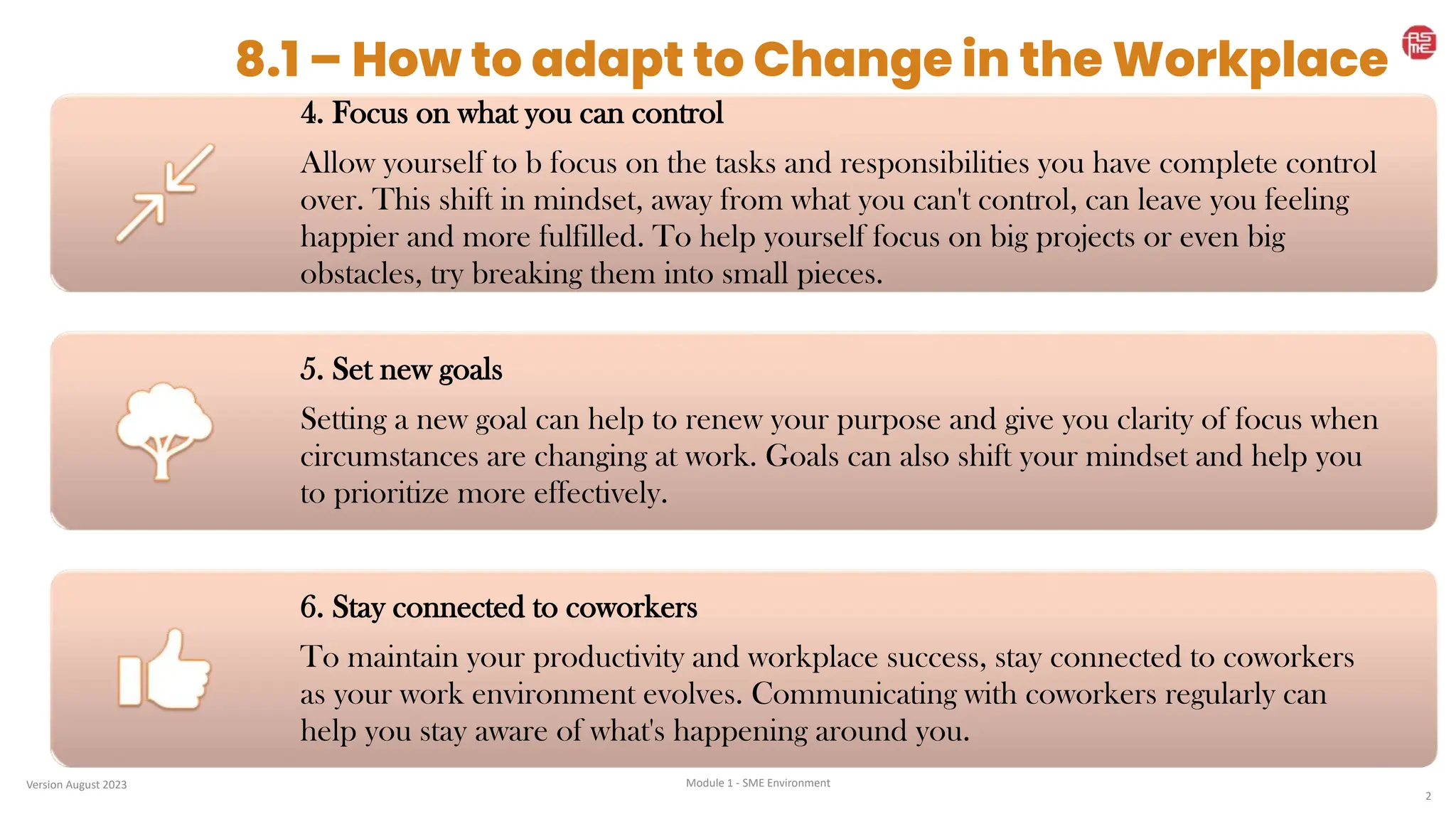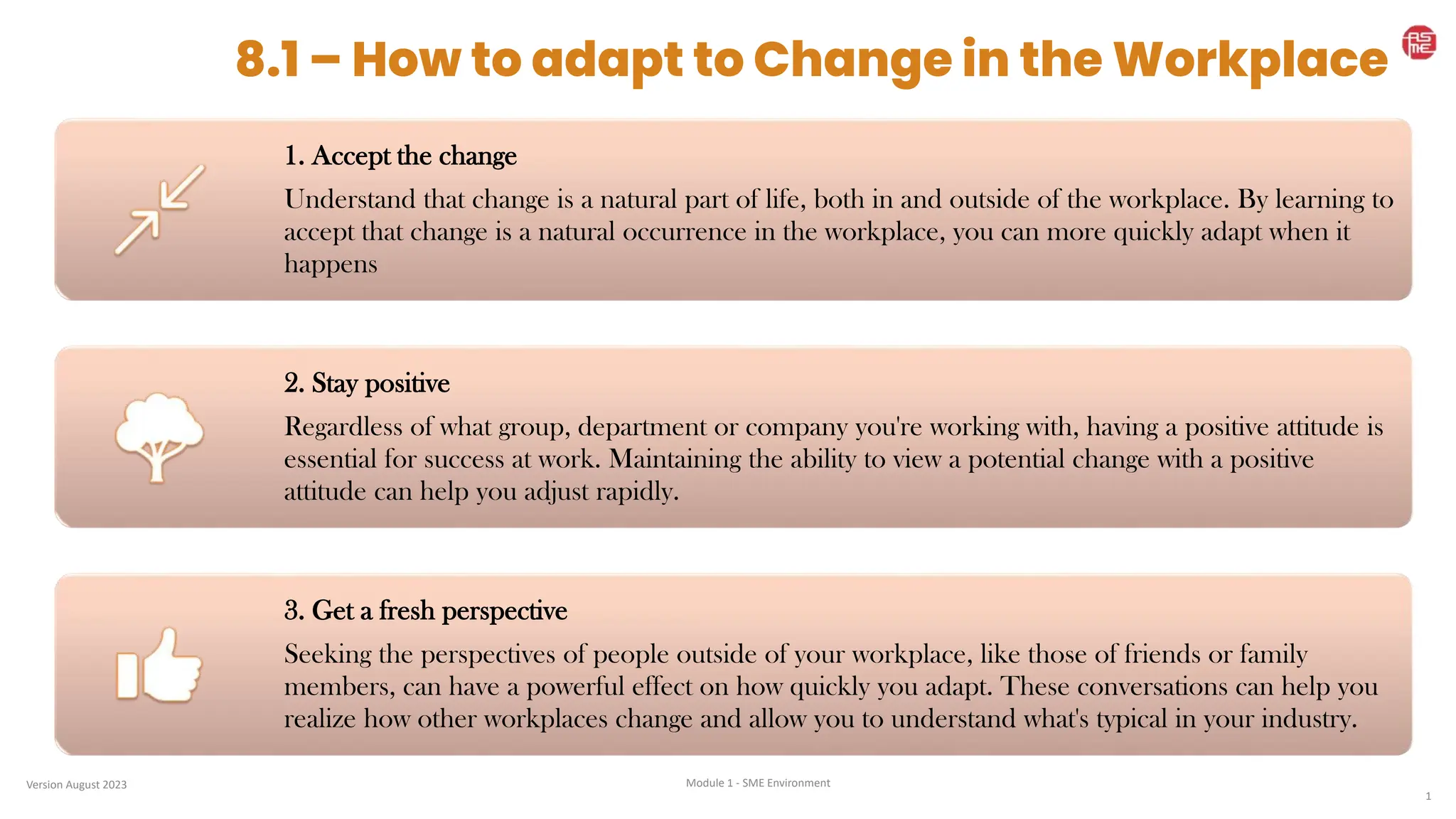 The document outlines strategies for adapting to change in the workplace, emphasizing the acceptance of change as a natural occurrence. Key approaches include maintaining a positive attitude, seeking external perspectives, focusing on controllable aspects, setting new goals, and staying connected with coworkers. These strategies aim to enhance productivity and foster a supportive work environment during transitions.