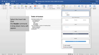 This document provides instructions for inserting a header into a Microsoft Word document. It outlines 3 steps: 1) Click the Insert tab and select the Header command, 2) Choose Blank or a built-in header option from the drop-down menu, 3) Type information into the header and hit Esc when finished.