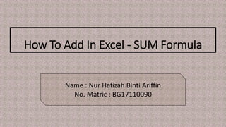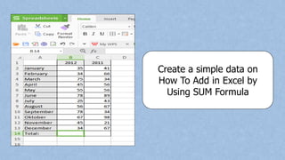 The document provides instructions on how to add numbers in Excel using the SUM formula. It explains to type "=SUM" followed by the cell range containing the numbers, such as "B2:B13", and drag the formula down to automatically add the numbers. The SUM formula allows you to easily total numbers across multiple cells in Excel.