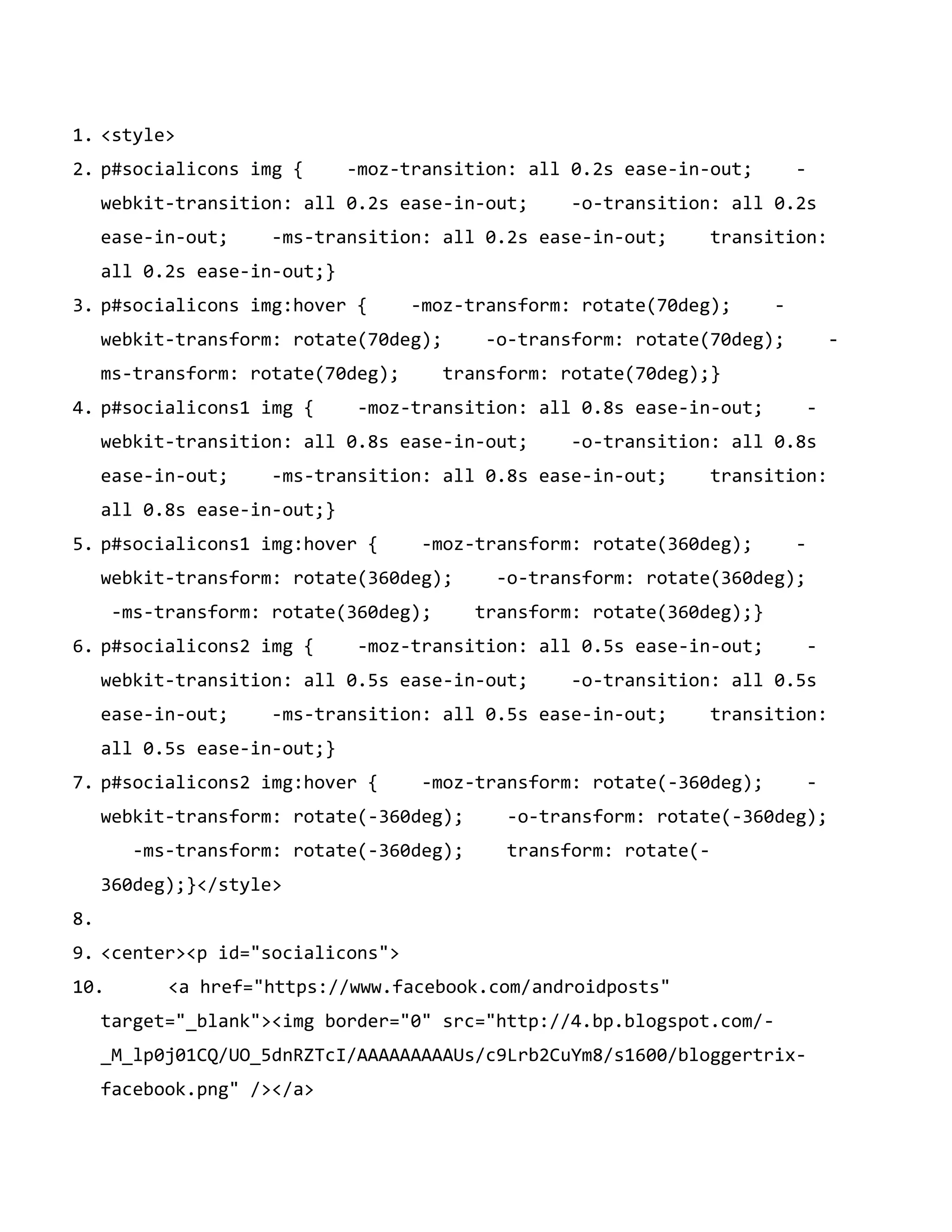 The document contains CSS code to apply transitions and rotations to images on hover. Images within different ID tags will rotate at different speeds and angles on hover: #socialicons images rotate 70 degrees in 0.2 seconds, #socialicons1 images rotate 360 degrees in 0.8 seconds, and #socialicons2 images rotate -360 degrees in 0.5 seconds. The HTML portion then displays social media icons with these IDs that will rotate on hover as defined by the CSS.
