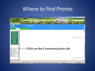 This document provides instructions for students on how to download and use the Pronto communication application. It outlines the sign up process which involves providing your information, email verification, and downloading and installing the Pronto file. Students are then able to use Pronto to chat with teachers and ask any questions by messaging in Blackboard or contacting their teacher by text or phone.