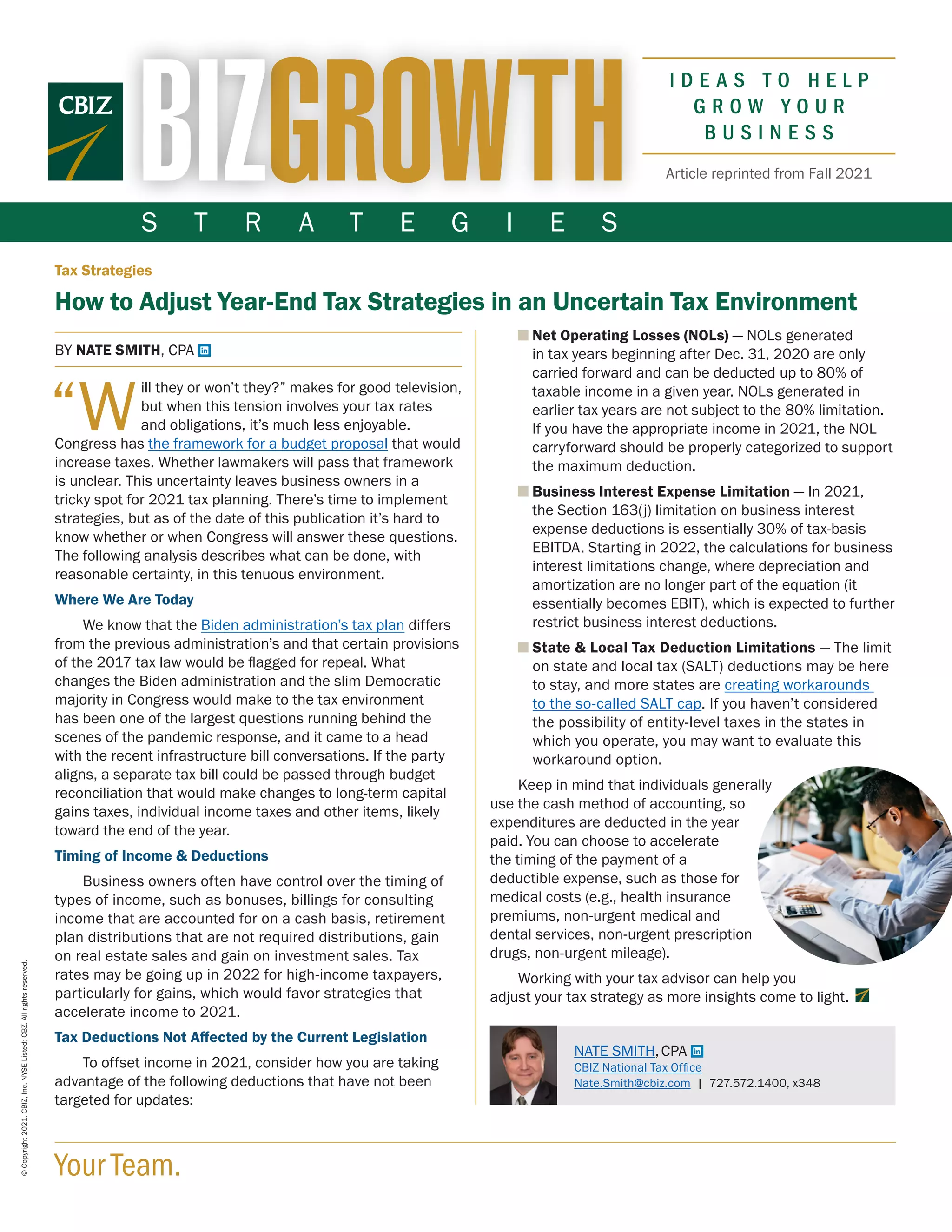 The document discusses strategies for adjusting year-end tax planning amid uncertainty regarding potential tax increases proposed by Congress. It highlights the differences between the current administration's tax approach and the previous one, emphasizing the importance of timing income and deductions for high-income earners in 2021. Key tax considerations include net operating losses, business interest expense limitations, and state and local tax deduction challenges.