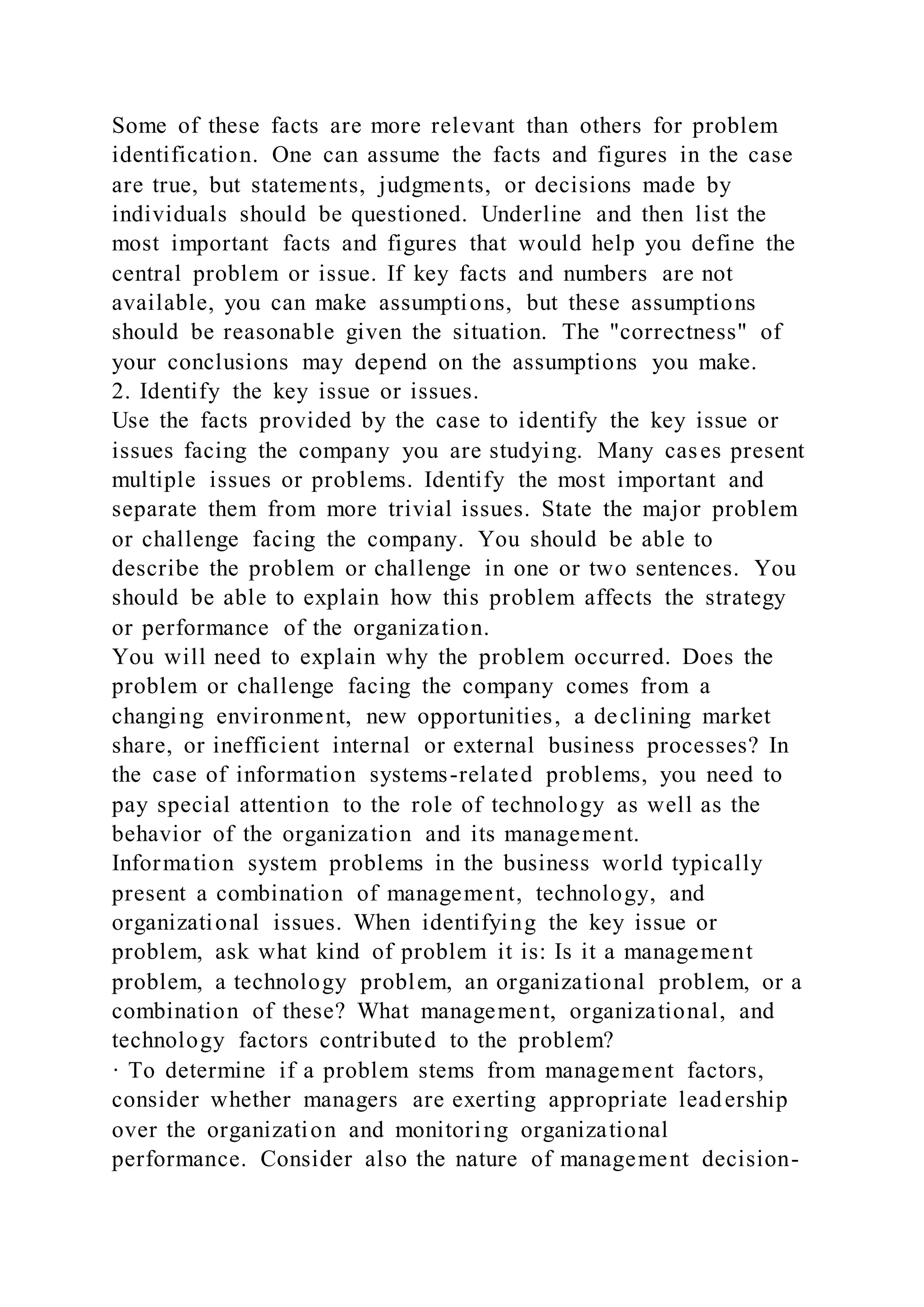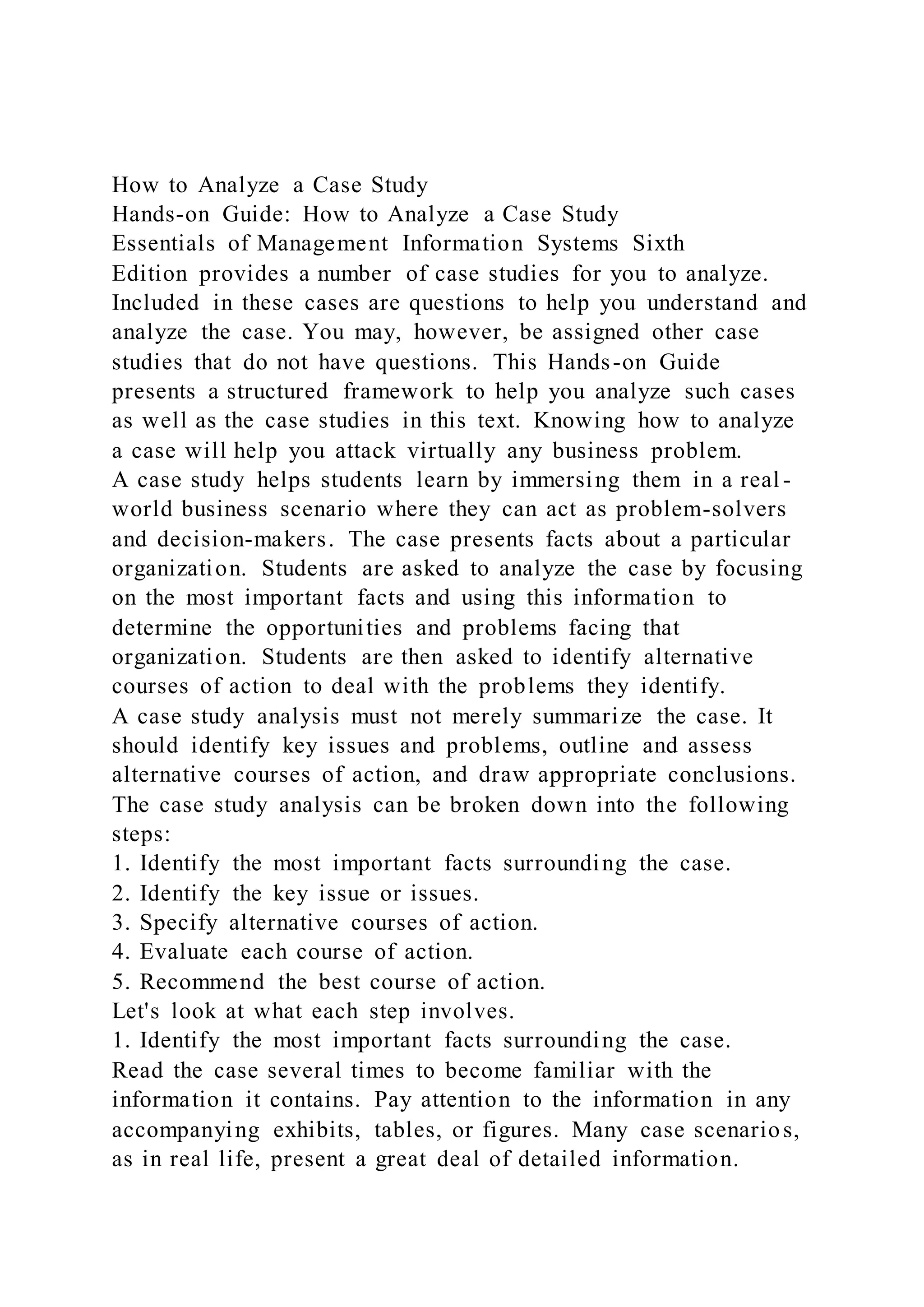 The document provides a step-by-step guide for analyzing a case study. It explains that a case study immerses students in a real-world business scenario where they can act as problem-solvers and decision-makers. The guide outlines five steps for analyzing a case study: 1) identify important facts, 2) identify the key issue(s), 3) specify alternative courses of action, 4) evaluate each alternative, and 5) recommend the best course of action. It then describes each step in detail, emphasizing the need to understand the problem, consider different perspectives, and logically justify the recommended solution based on the analysis.