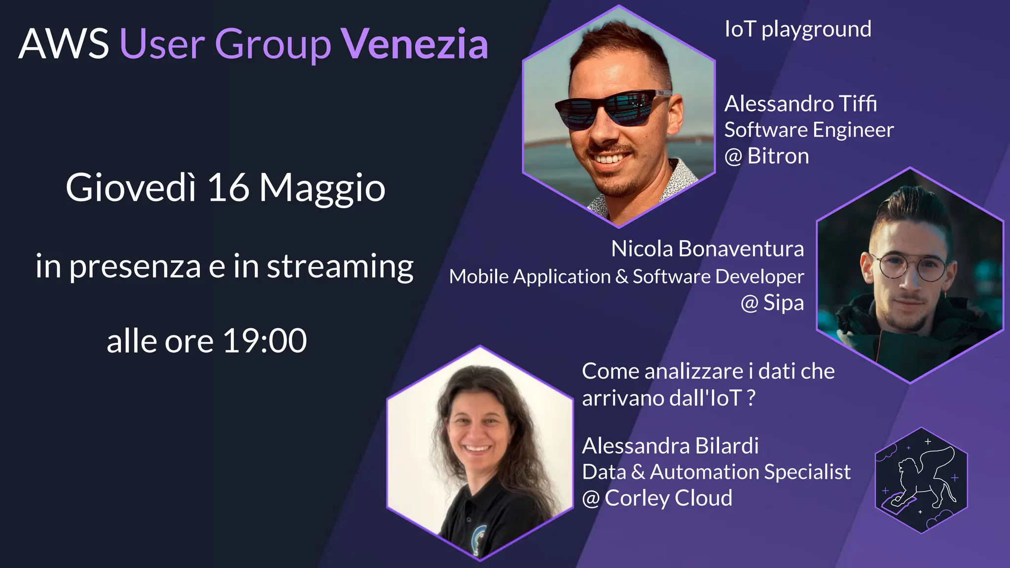 The document outlines an event scheduled for May 16, featuring discussions on analyzing IoT data, with speakers including Alessio Tiffi and Alessandra Bilardi. It mentions AWS services and tools relevant to IoT, such as AWS IoT Core and Amazon Kinesis. The event is part of the AWS User Group in Venice and includes information about future meetups and the AWS Community Day in Rome.
