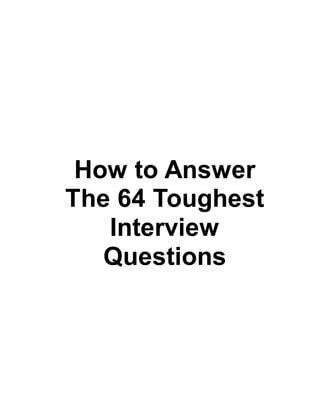 This document provides guidance on answering tough interview questions. It begins with an introduction and dedication to courage and knowledge in career challenges. The document then lists 64 common interview questions and provides recommendations and examples for effective answers. For each question, it identifies potential traps or pitfalls in answering and recommends the "best answer" approach, emphasizing fitting one's qualifications to the employer's needs. Overall, the document stresses being positive, matching one's strengths to the job requirements, and avoiding weaknesses or faults in responses.