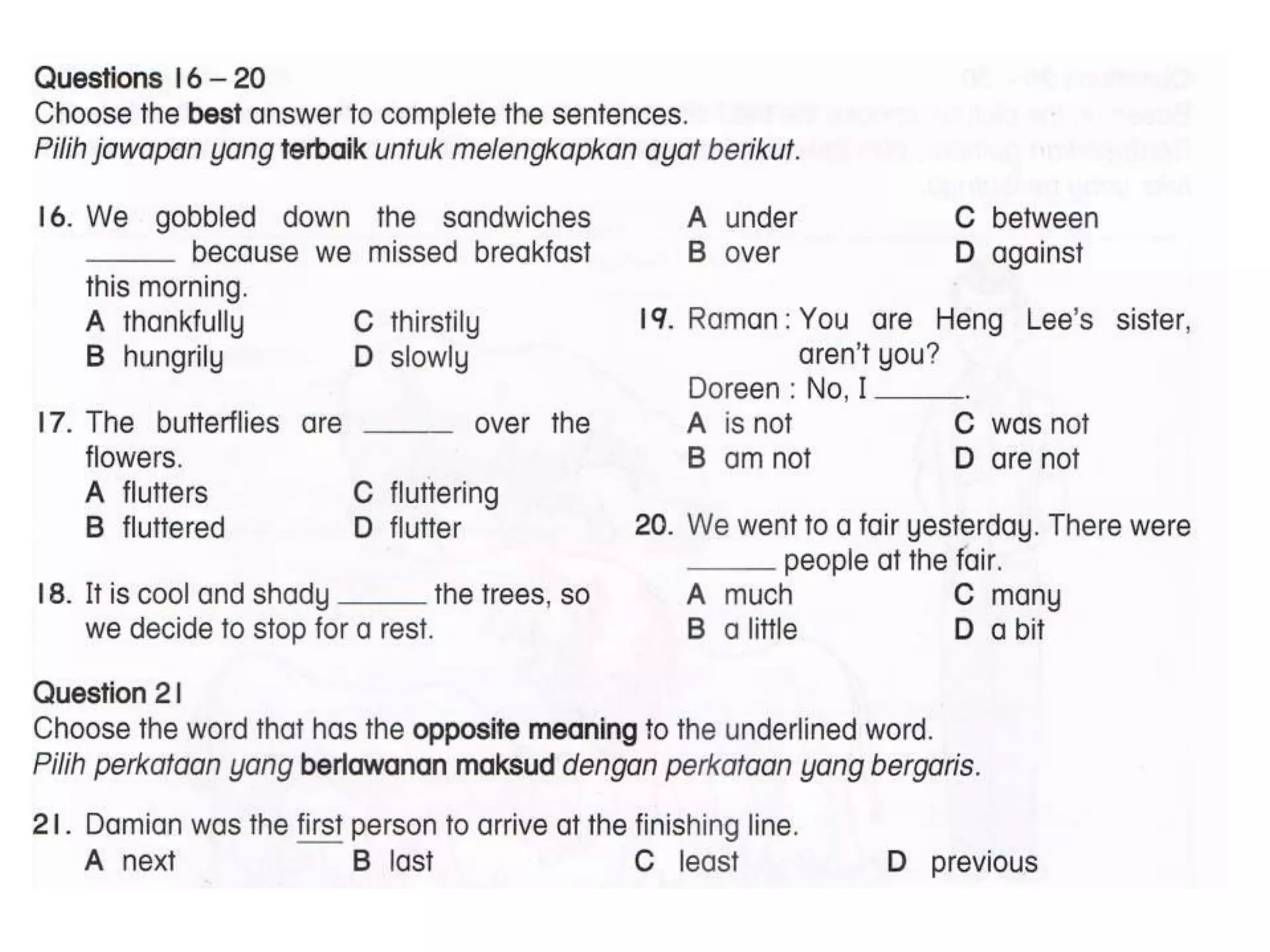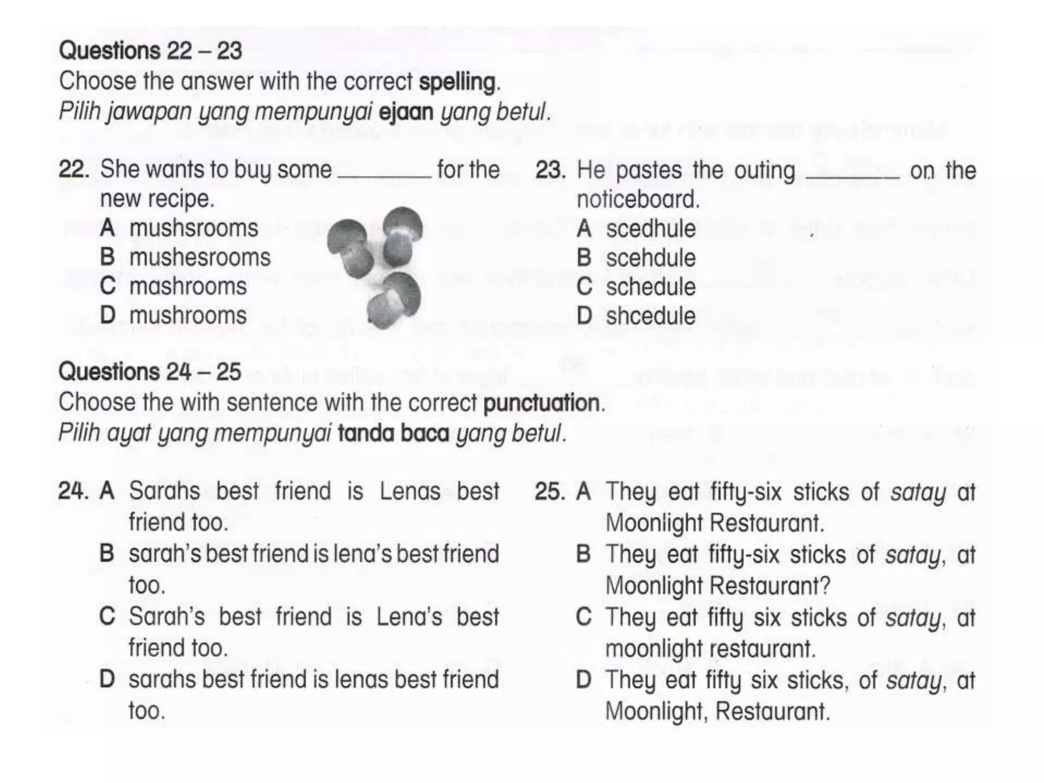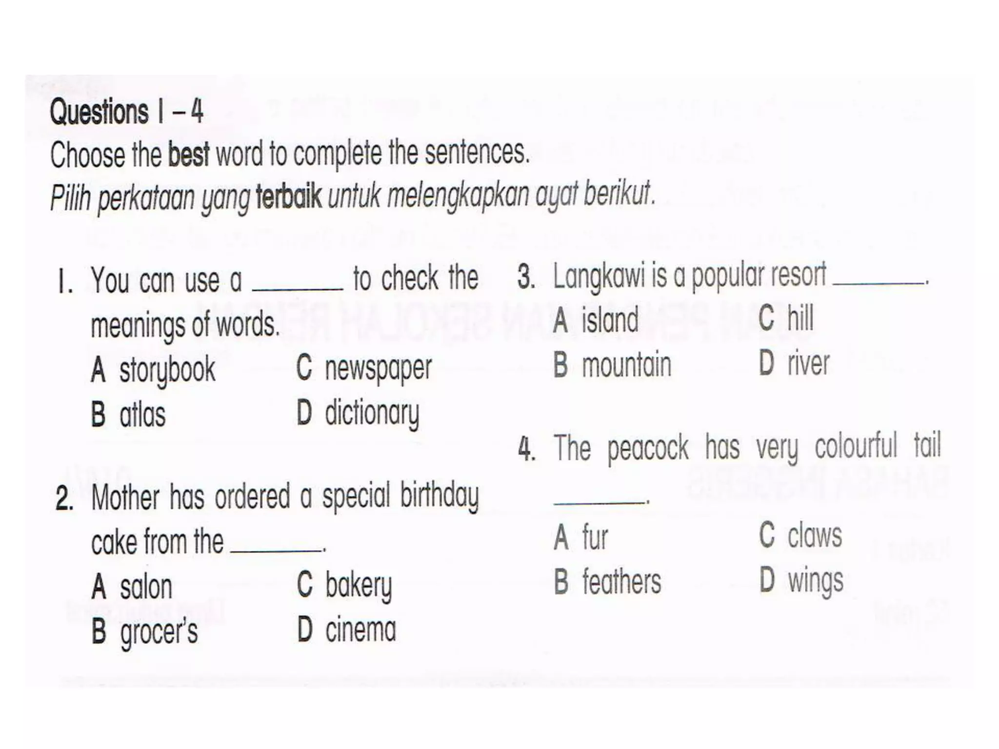This document provides tips and strategies for effectively answering questions on the UPSR English Language Paper 1 exam. It outlines general advice such as reading instructions carefully, answering easy questions first, and checking answers. It then provides specific guidance for different types of questions on the exam, including vocabulary, phrases, sentences, social expressions, grammar, spelling, punctuation, text completion, and comprehension. Specific tips are given for each question type, such as underlining clues and circling the best answer. Sample exam questions are also included.