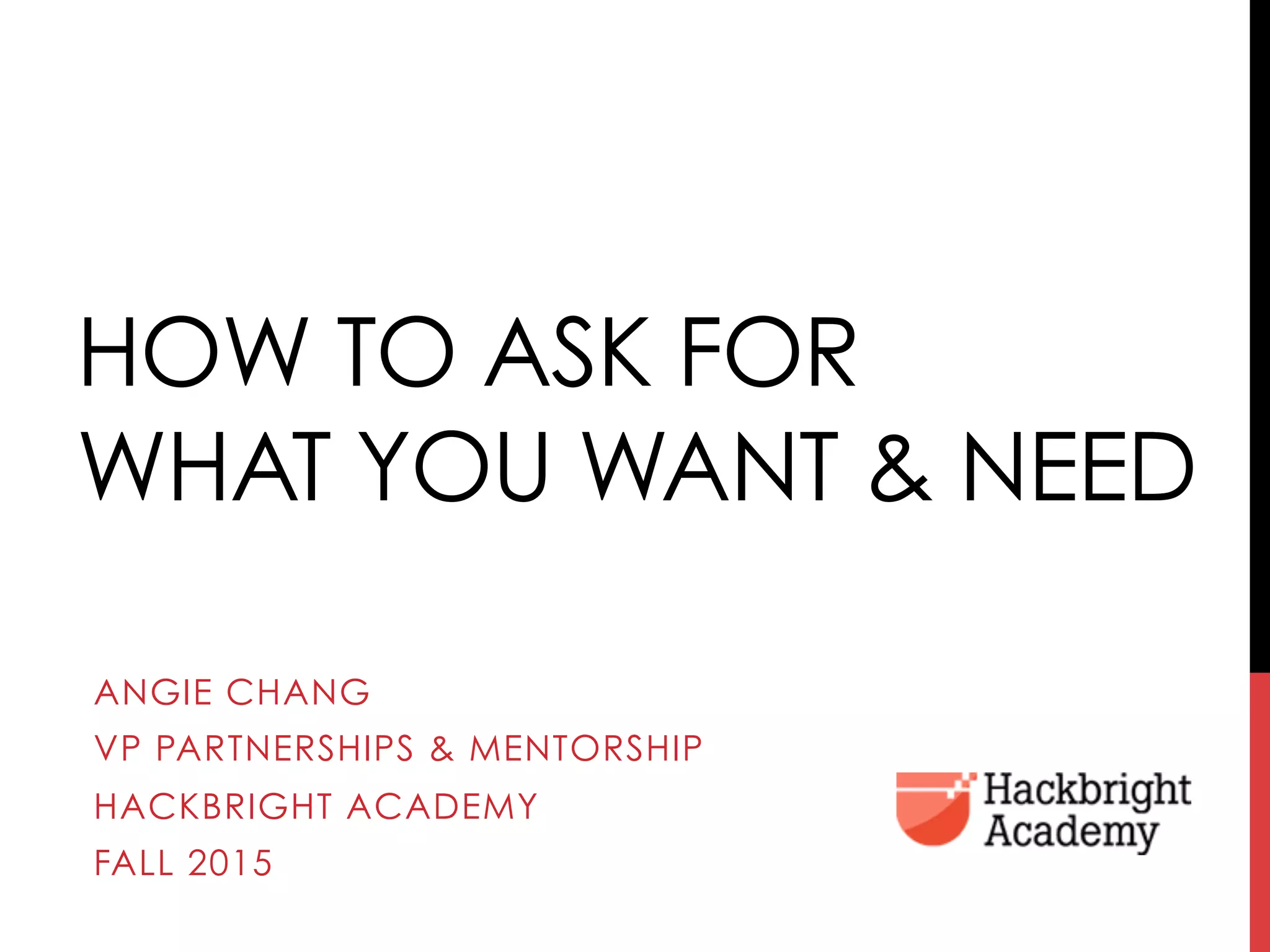The document offers strategies for job seekers to adopt an entrepreneurial mindset and effectively ask for what they want in their careers. It emphasizes the importance of optimism, adaptability, and continuous learning, while providing actionable networking tips and advice for building a strong personal story. Additionally, it highlights utilizing resources such as career services and various online platforms to enhance visibility and opportunities in the job market.