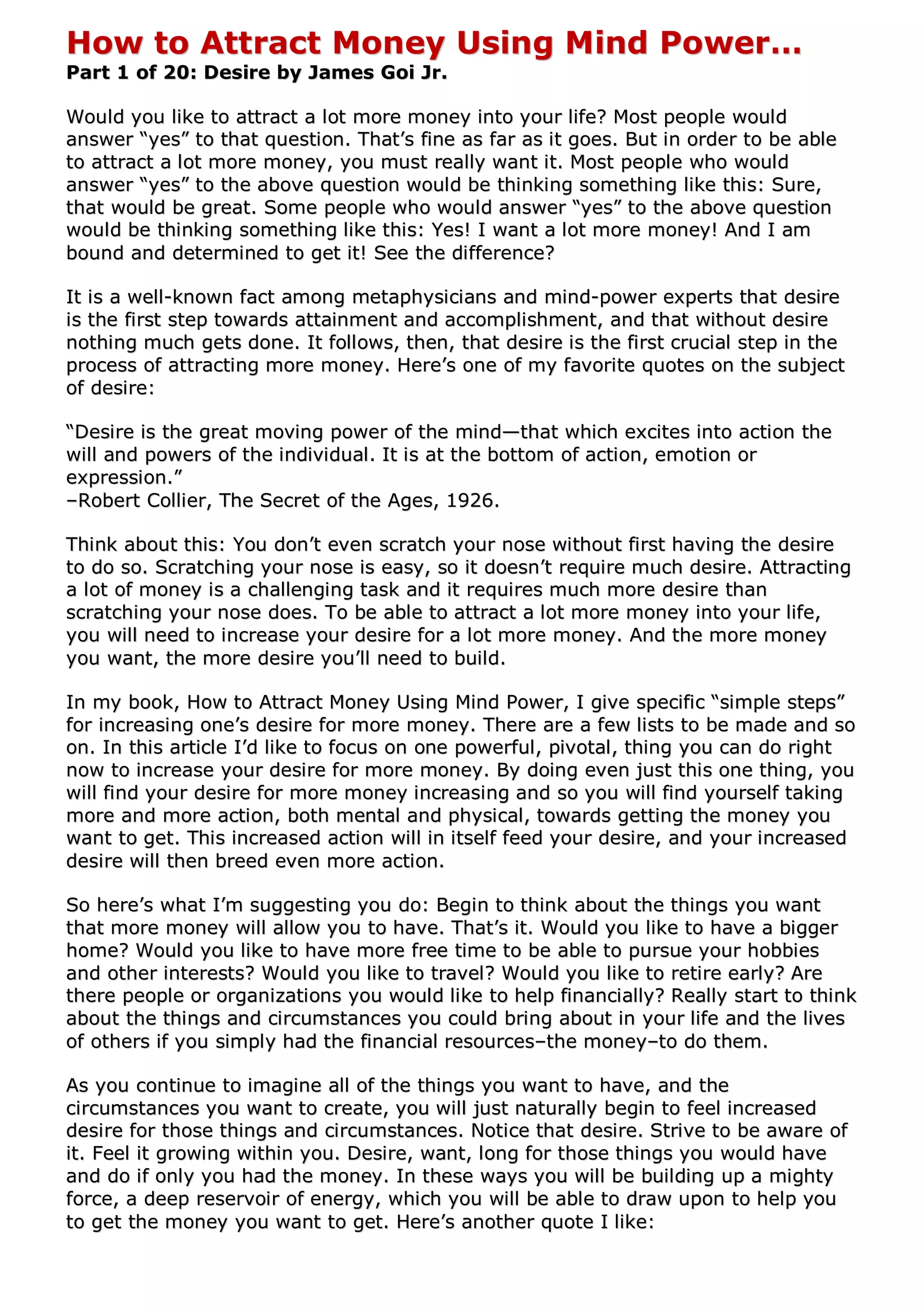 JJaammeess aanndd II aarree ccuurrrreennttllyy ppllaannnniinngg hhiiss ffiirrsstt WWeebbiinnaarr –– TThhee MMiinndd PPoowweerr WWaayy ttoo AAttttrraacctt $$$$$$ ffoorr MMaayy 44tthh aanndd wwee nneeeedd yyoouurr hheellpp.. PPlleeaassee vviissiitt TThhee MMiinndd PPoowweerr WWaayy ttoo AAttttrraacctt $$$$$$aanndd lleett uuss kknnooww wwhhaatt qquueessttiioonnss yyoouu wwaanntt aannsswweerreedd.. PPaarrtt 44 ooff 2200:: MMoonneeyy MMiinnddsseett __ TToo bbrriinngg tthhiiss ssuubbjjeecctt ooff hhooww ttoo aattttrraacctt mmoonneeyy uussiinngg mmiinndd ppoowweerr ddoowwnn ttoo aa bbaassiicc ffooccaall ppooiinntt,, iitt’’ss aabboouutt ddeevveellooppiinngg tthhee pprrooppeerr ““mmoonneeyy mmiinnddsseett..”” SSoo wwhhaatt iiss aa mmoonneeyy mmiinnddsseett?? AAtt iittss ccoorree,, yyoouurr mmoonneeyy mmiinnddsseett iiss ssiimmppllyy tthhee wwaayy yyoouu tthhiinnkk aanndd ffeeeell aabboouutt mmoonneeyy.. SSoo ffaarr iinn tthhiiss sseerriieess ooff aarrttiicclleess,, wwee’’vvee llooookkeedd aatt tthhee ssuubbjjeeccttss ooff ddeessiirree,, bbeelliieeff aanndd eexxppeeccttaannccyy.. WWeellll,, yyoouurr mmoonneeyy mmiinnddsseett iinncclluuddeess yyoouurr mmoonneeyy--rreellaatteedd ddeessiirreess,, bbeelliieeffss,, aanndd eexxppeeccttaattiioonnss.. AAnndd,, ttoooo,, yyoouurr mmoonneeyy mmiinnddsseett iinncclluuddeess aannyy mmoonneeyy-- rreellaatteedd rreesseennttmmeennttss,, rreeggrreettss,, aanndd gguuiilltt yyoouu mmaayy hhaavvee.. EEvveerryy ssiinnggllee tthhoouugghhtt aanndd ffeeeelliinngg yyoouu hhaavvee wwhhiicchh hhaass aannyytthhiinngg aatt aallll ttoo ddoo wwiitthh mmoonneeyy iiss aa ppaarrtt ooff yyoouurr mmoonneeyy mmiinnddsseett.. MMoonneeyy MMiinnddsseett iiss tthhee ttiittllee ooff cchhaapptteerr 44 iinn mmyy bbooookk,, HHooww ttoo AAttttrraacctt MMoonneeyy UUssiinngg MMiinndd PPoowweerr.. II ooppeenn tthhaatt cchhaapptteerr wwiitthh tthhiiss qquuoottee:: ““FFoorrttuunneess ggrraavviittaattee ttoo mmeenn wwhhoossee mmiinnddss hhaavvee bbeeeenn pprreeppaarreedd ttoo aattttrraacctt tthheemm,, jjuusstt aass ssuurreellyy aass wwaatteerr ggrraavviittaatteess ttoo tthhee oocceeaann..”” ––NNaappoolleeoonn HHiillll,, TThhiinnkk aanndd GGrrooww RRiicchh,, 11993377 TThhaatt qquuoottee mmaakkeess aa ggoooodd ppooiinntt:: YYoouu mmuusstt pprreeppaarree yyoouurr mmiinndd ttoo aattttrraacctt mmoonneeyy.. WWhhaatt yyoouu aarree ddooiinngg iiss ccrreeaattiinngg aa ssttaattee ooff mmiinndd.. II ccaallll tthhiiss ssttaattee ooff mmiinndd yyoouurr mmoonneeyy mmiinnddsseett.. YYoouurr mmoonneeyy--rreellaatteedd tthhoouugghhttss aanndd ffeeeelliinnggss ddeetteerrmmiinnee iiff tthhee rreessuullttiinngg vviibbrraattiioonnss ooff ccoonnsscciioouussnneessss wwiillll tteenndd ttoo aattttrraacctt oorr rreeppeell mmoonneeyy.. IIff yyoouu ddiilliiggeennttllyy aanndd ssiinncceerreellyy ddoo wwhhaatt yyoouu aarree lleeaarrnniinngg ttoo ddoo iinn tthheessee aarrttiicclleess,, yyoouu wwiillll ccrreeaattee aa ppoowweerrffuull mmoonneeyy mmiinnddsseett wwhhiicchh wwiillll aattttrraacctt ttoo yyoouu aallll ooff tthhee mmoonneeyy yyoouu wwaanntt aanndd nneeeedd.. TThhiinnkk aabboouutt iitt.. DDoo yyoouu bbeelliieevvee tthhaatt yyoouu ccaann ddeevveelloopp aa mmoonneeyy mmiinnddsseett wwhhiicchh wwiillll aallllooww yyoouu ttoo aattttrraacctt aallll ooff tthhee mmoonneeyy yyoouu wwaanntt aanndd nneeeedd?? WWeellll,, tthhaatt bbeelliieeff,, oorr llaacckk ooff iitt,, iiss oonnee ooff tthhee mmoosstt ppiivvoottaall eelleemmeennttss ooff yyoouurr mmoonneeyy mmiinnddsseett iittsseellff.. SSoo,, hhooww wwiillll yyoouu ddeevveelloopp yyoouurr mmoonneeyy mmiinnddsseett?? TToo aa llaarrggee ddeeggrreeee,, yyoouu’’llll ddeevveelloopp yyoouurr mmoonneeyy mmiinnddsseett aass aa nnaattuurraall rreessuulltt ooff ddooiinngg mmuucchh ooff tthhee ootthheerr mmiinndd wwoorrkk yyoouu’’llll bbee ddooiinngg.. YYoouu’’llll ddeevveelloopp yyoouurr ppoossiittiivvee mmoonneeyy mmiinnddsseett bbyy iinnccrreeaassiinngg yyoouurr ddeessiirree,, ccuullttiivvaattiinngg bbeelliieeff,, ccrreeaattiinngg eexxppeeccttaannccyy aanndd sseettttiinngg mmoonneeyy ggooaallss;; bbyy tthhiinnkkiinngg eenndd rreessuullttss aanndd tthhiinnkkiinngg aanndd ffeeeelliinngg aass iiff;; bbyy ssppeeaakkiinngg aass iiff aanndd aaccttiinngg aass iiff;; bbyy uussiinngg aaffffiirrmmaattiioonnss aanndd bbyy vviissuuaalliizziinngg;; bbyy ggeettttiinngg oorrggaanniizzeedd iinn wwaayyss wwhhiicchh hheellpp yyoouu aattttrraacctt mmoonneeyy;; bbyy tthhiinnkkiinngg,, ffeeeelliinngg,, aanndd aaccttiinngg iinn hhaarrmmoonnyy wwiitthh tthhee ““llaawwss ooff mmoonneeyy””;; aanndd bbyy ddooiinngg ootthheerr rreellaatteedd mmiinndd--wwoorrkk.. SSoo,, mmuucchh ooff tthhee wwoorrkk ooff ddeevveellooppiinngg yyoouurr mmoonneeyy mmiinnddsseett wwiillll aaccttuuaallllyy ttaakkee ppllaaccee wwhhiillee yyoouu aarree wwoorrkkiinngg oonn tthhee ootthheerr aarreeaass ooff yyoouurr mmiinndd wwoorrkk.. IInn aaddddiittiioonn ttoo tthhaatt,, II ggiivvee ssppeecciiffiicc iinnssttrruuccttiioonnss iinn tthhee bbooookk ffoorr ddeeaalliinngg wwiitthh yyoouurr mmoonneeyy--rreellaatteedd rreesseennttmmeennttss,, rreeggrreettss,, aanndd gguuiilltt.. AAnndd eevveenn tthhoossee tthhiinnggss wwiillll tteenndd ttoo nnaattuurraallllyy iimmpprroovvee aass yyoouu lleeaarrnn ooff aanndd bbeeggiinn ttoo pprraaccttiiccee tthhiiss nneeww wwaayy ooff tthhiinnkkiinngg.. HHeerree’’ss ssoommeetthhiinngg yyoouu ccaann ddoo rriigghhtt nnooww:: BBeeggiinn ttoo lleett ggoo ooff nneeggaattiivvee mmoonneeyy--rreellaatteedd eemmoottiioonnss.. DDoo yyoouu hhaavvee rreesseennttmmeenntt ttoowwaarrddss aannyyoonnee bbeeccaauussee yyoouu tthhiinnkk tthhaatt ppeerrssoonn ttooookk aaddvvaannttaaggee ooff yyoouu ffiinnaanncciiaallllyy oorr ssttoollee ffrroomm yyoouu oorr ddiiddnn’’tt ppaayy yyoouu ssoommeetthhiinngg tthheeyy oowweedd yyoouu?? SSttrriivvee ttoo rreelleeaassee tthhaatt rreesseennttmmeenntt.. DDoo yyoouu hhaavvee rreeggrreettss bbeeccaauussee