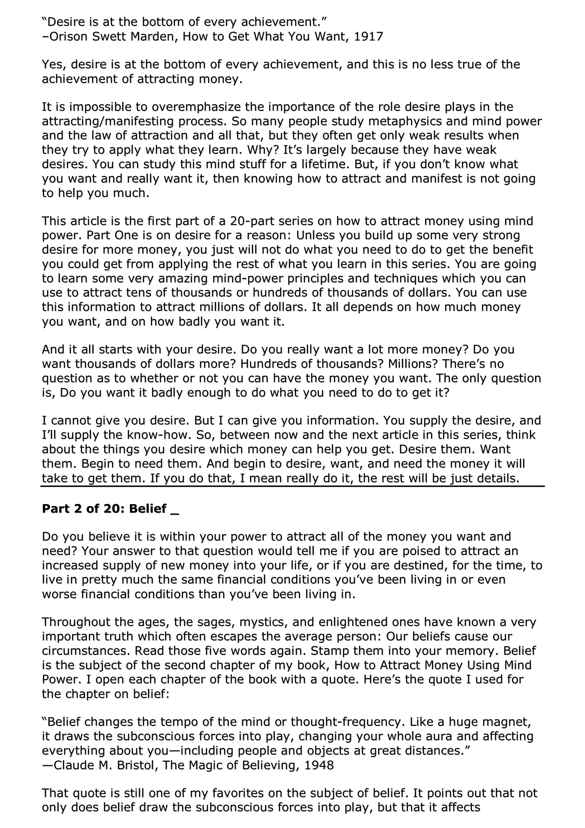 ttoo aa cceerrttaaiinn tthhoouugghhtt wwiitthh ddyynnaammiicc wwiillll ppoowweerr,, iitt ffiinnaallllyy aassssuummeess aa ttaannggiibbllee oouuttwwaarrdd ffoorrmm..”” ——PPaarraammaahhaannssaa YYooggaannaannddaa,, TThhee LLaaww ooff SSuucccceessss,, 11994444 TThhaatt’’ss wwhhaatt wwee aarree ttaallkkiinngg aabboouutt hheerree:: cclliinnggiinngg ttoo cceerrttaaiinn tthhoouugghhttss——tthhoouugghhttss ooff tthhee ffiinnaanncciiaall eenndd rreessuullttss yyoouu wwaanntt ttoo ccrreeaattee iinn yyoouurr lliiffee.. IIff yyoouu ccoonnttiinnuuee wwiitthh tthhiiss pprroocceessss,, tthheenn yyoouurr tthhoouugghhttss wwiillll aatt ssoommee ppooiinntt aassssuummee aa ““ttaannggiibbllee oouuttwwaarrdd ffoorrmm..”” MMoorree ssppeecciiffiiccaallllyy ffoorr oouurr ppuurrppoosseess,, yyoouurr ffiinnaanncciiaall cciirrccuummssttaanncceess wwiillll bbee wwhhaatt yyoouu ddeecciiddee tthheeyy sshhoouulldd bbee.. PPaarrtt 77 ooff 2200:: TThhiinnkk aanndd FFeeeell AAss IIff __ TThhee tthhoouugghhttss wwee tthhiinnkk aanndd tthhee ffeeeelliinnggss wwee ffeeeell sseett iinn mmoottiioonn bbootthh tthhee ssuubbccoonnsscciioouuss mmiinndd aanndd tthhee uunniivveerrssee.. BByy hhooww wwee tthhiinnkk aanndd ffeeeell,, wwee ccaauussee tthhee cciirrccuummssttaanncceess ooff oouurr lliivveess,, aanndd tthhaatt iinncclluuddeess oouurr ffiinnaanncciiaall cciirrccuummssttaanncceess.. TThhee ffiinnaanncciiaall cciirrccuummssttaanncceess wwhhiicchh ccoommee aabboouutt wwiillll aallwwaayyss tteenndd ttoo bbee iinn lliinnee wwiitthh tthhee tthhoouugghhttss aanndd ffeeeelliinnggss wwhhiicchh ggiivvee rriissee ttoo tthheemm.. CChhaapptteerr 77 iinn mmyy bbooookk,, HHooww ttoo AAttttrraacctt MMoonneeyy UUssiinngg MMiinndd PPoowweerr,, iiss ccaalllleedd ““TThhiinnkk aanndd FFeeeell AAss IIff..”” TThhee ttiittllee iiss ffaaiirrllyy sseellff--eexxppllaannaattoorryy.. TThhee tteecchhnniiqquuee iiss bbaassiiccaallllyy tthhiiss:: aallwwaayyss ssttrriivvee ttoo tthhiinnkk aanndd ffeeeell aass iiff tthhee ffiinnaanncciiaall cciirrccuummssttaanncceess yyoouu wwaanntt ttoo bbrriinngg aabboouutt eeiitthheerr aarree nnooww oorr wwiillll bbee rreeaalliittyy.. HHeerree’’ss tthhee qquuoottee wwiitthh wwhhiicchh II ooppeenn tthhiiss aallll-- iimmppoorrttaanntt cchhaapptteerr:: ““WWhhaatt yyoouu ppuutt iinnttoo yyoouurr mmiinndd iinn tthhee nnaattuurree ooff yyoouurr tthhoouugghhttss aanndd ffeeeelliinnggss……iiss wwhhaatt ssuubbsseeqquueennttllyy mmaatteerriiaalliizzeess ffoorr yyoouu iinn yyoouurr oouutteerr wwoorrlldd..”” ——HHaarroolldd SShheerrmmaann,, TThhee NNeeww TTNNTT,, MMiirraaccuulloouuss PPoowweerr WWiitthhiinn YYoouu,, 11996666 TThheerree aarree aa lloott ooff pprriinncciipplleess aanndd tteecchhnniiqquueess aassssoocciiaatteedd wwiitthh tthhiiss ssuubbjjeecctt ooff aattttrraaccttiinngg mmoonneeyy uussiinngg mmiinndd ppoowweerr.. BBuutt bbooiill tthhiiss ssuubbjjeecctt ddoowwnn ttoo iittss eesssseennccee,, aanndd yyoouu’’rree lleefftt wwiitthh tthhiiss ccoonncceepptt:: TThhoouugghhtt aanndd ffeeeelliinngg ccrreeaattee.. AAllll ooff tthhee ootthheerr pprriinncciipplleess aanndd tteecchhnniiqquueess hhaavviinngg ttoo ddoo wwiitthh aattttrraaccttiinngg mmoonneeyy wwiitthh mmiinndd ppoowweerr aarree rreellaatteedd iinn oonnee wwaayy oorr aannootthheerr ttoo tthhee ffaacctt tthhaatt tthhiinnkkiinngg aanndd ffeeeelliinngg aarree ccrreeaattiivvee aaccttss.. TThhoouugghhtt pprroovviiddeess tthhee bblluueepprriinntt oorr tthhee oouuttlliinnee ffoorr wwhhaatt iiss ttoo bbee ccrreeaatteedd;; ffeeeelliinngg pprroovviiddeess tthhee lliiffee aanndd eenneerrggyy ffoorr wwhhaatt iiss ttoo bbee ccrreeaatteedd.. IIff yyoouu wwaanntt ttoo ggeett bbeetttteerr aatt ccrreeaattiinngg tthhee oovveerraallll lliiffee yyoouu ddeessiirree,, yyoouu’’llll wwoorrkk aatt ggeettttiinngg bbeetttteerr aatt ggoovveerrnniinngg yyoouurr tthhoouugghhttss aanndd ffeeeelliinnggss.. IIff yyoouu wwaanntt ttoo ggeett bbeetttteerr aatt ccrreeaattiinngg tthhee ffiinnaanncciiaall lliiffee yyoouu ddeessiirree,, yyoouu’’llll wwoorrkk aatt ggeettttiinngg bbeetttteerr aatt ggoovveerrnniinngg yyoouurr mmoonneeyy--rreellaatteedd tthhoouugghhttss aanndd ffeeeelliinnggss.. AAggaaiinn,, hheerree’’ss tthhee ““tthhiinnkk aanndd ffeeeell aass iiff”” tteecchhnniiqquuee:: aallwwaayyss ssttrriivvee ttoo tthhiinnkk aanndd ffeeeell aass iiff tthhee ffiinnaanncciiaall cciirrccuummssttaanncceess yyoouu wwaanntt ttoo bbrriinngg aabboouutt eeiitthheerr aarree nnooww oorr wwiillll bbee rreeaalliittyy.. IItt’’ss aa ccrruucciiaall tteecchhnniiqquuee ffoorr wwhhaatt wwee aarree ttrryyiinngg ttoo aaccccoommpplliisshh aanndd,, iiff yyoouu tthhiinnkk aabboouutt iitt,, tthhee ootthheerr mmiinndd--ppoowweerr tteecchhnniiqquueess II tteeaacchh aallll iinn ssoommee wwaayy ddiirreeccttllyy aaffffeecctt yyoouurr mmoonneeyy--rreellaatteedd tthhoouugghhttss aanndd ffeeeelliinnggss.. IItt’’ss aallll aabboouutt tthhee tthhoouugghhttss aanndd ffeeeelliinnggss,, aanndd tthhee ccaauussaattiivvee oorr ssuubbsseeqquueenntt iimmaaggeess wwhhiicchh ccoommee iinnttoo bbeeiinngg.. IImmaaggeess ccaann ggiivvee rriissee ttoo tthhoouugghhttss aanndd ffeeeelliinnggss;; tthhoouugghhttss aanndd ffeeeelliinnggss ccaann ggiivvee rriissee ttoo iimmaaggeess.. RReemmeemmbbeerr,, tthhee llaanngguuaaggee ooff yyoouurr ssuubbccoonnsscciioouuss mmiinndd iiss iimmaaggeess.. YYoouu wwaanntt tthhee iimmaaggeess yyoouu ppuurrppoosseellyy oorr iinnaaddvveerrtteennttllyy ccrreeaattee ttoo bbee ooff tthhiinnggss aanndd ccoonnddiittiioonnss yyoouu’’dd lliikkee ttoo sseeee ccoommee aabboouutt iinn yyoouurr lliiffee.. AAss yyoouu nnooww kknnooww,, tthheessee iimmaaggeess wwiillll bbee ddeetteerrmmiinneedd bbyy tthhee ccoonntteenntt aanndd nnaattuurree ooff yyoouurr tthhoouugghhttss aanndd ffeeeelliinnggss..