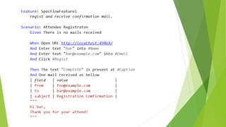 This document discusses how to automate testing of a web application that includes an email sending feature. It recommends using Black Jumbo Dog, an open source desktop application that can act as an SMTP server. Black Jumbo Dog exposes a web API that allows test code to control the SMTP server, clean up received emails, and retrieve emails to validate contents. The test code would communicate with Black Jumbo Dog via its web API while also interacting with the web application using a tool like Selenium.