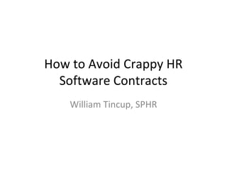 The document discusses 10 things to consider when negotiating HR software contracts with vendors to avoid unfavorable terms. These include ensuring the contract specifies data ownership, whether renewals automatically occur, guarantees around price increases, termination within 30 days, a process for exiting gracefully, training for all users, penalties for missed vendor goals, variable consulting hours, budget for adoption incentives, and caps on maintenance fees. The document advises remembering that software features only have value if users actually use them.