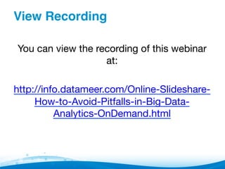 This document outlines a webinar on avoiding pitfalls in big data analytics, featuring speakers from Datameer and MapR, who emphasize the importance of Apache Hadoop for handling large data sets. Key topics include types of analytics, common pitfalls in implementations, and tips for optimizing the use of Hadoop. It highlights the need for proper planning, governance, and user-friendly platforms to maximize the effectiveness of big data initiatives.