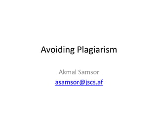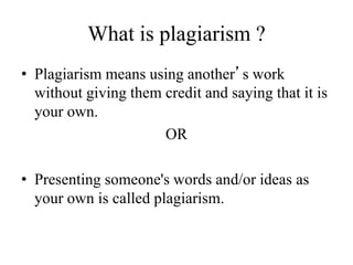 This document discusses plagiarism and how to avoid it. It defines plagiarism as presenting another's work as one's own without proper citation or credit. There are four main types of plagiarism discussed: copying, patchwriting, paraphrasing, and unintentional. The document provides examples of each type and guidelines for when to quote, paraphrase, or summarize sources. It also includes examples of APA citation style for different source types such as books, journal articles, and online sources. The key message is that plagiarism can be avoided by being honest about sources and giving proper credit when using others' work.