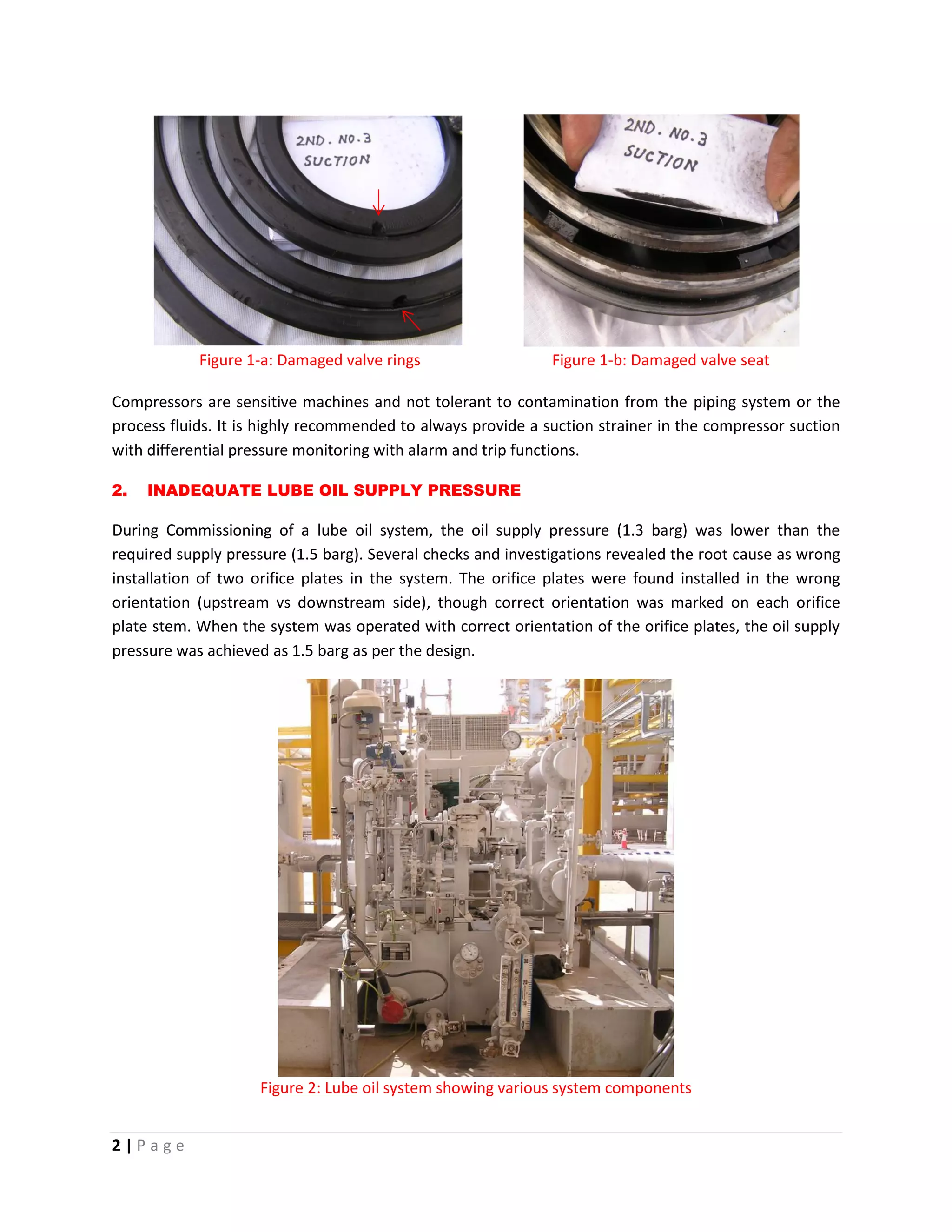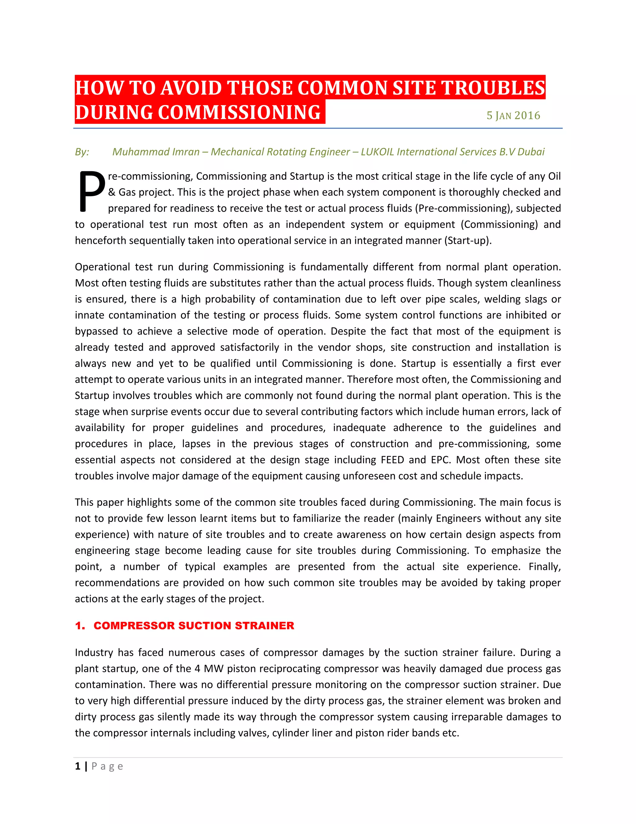 This document discusses common issues that arise during the commissioning stage of oil and gas projects. It begins by explaining that commissioning involves testing systems using substitute fluids and inhibited control functions, presenting new challenges compared to normal operation. Eight specific issues that often cause problems are then described in detail, including compressor damage from an unmonitored suction strainer, mechanical seal failures from contamination, high pump vibrations from improper installation, and safety hazards from a lack of safe design. The document emphasizes that addressing potential issues early in engineering and design can help avoid problems during commissioning.