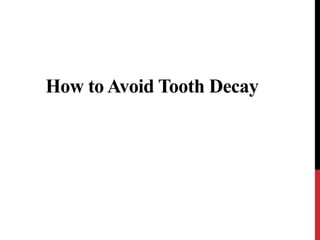 Tooth decay can be avoided through proper oral hygiene, a healthy diet, and regular dental checkups. Brushing teeth twice daily and using dental floss helps remove food debris that can lead to plaque and decay. Seeing a dentist regularly allows early detection and treatment of decay before more serious issues arise. Following a diet low in sugars and acids protects teeth, as these can increase decay risks. Proper care and prevention can help avoid the pain, discomfort, tooth loss and unattractive smiles caused by tooth decay.