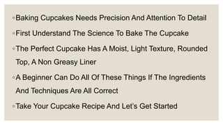 The guide provides detailed steps on baking perfect cupcakes, emphasizing the importance of precise ingredients and techniques, such as using room temperature eggs and butter. It outlines baking temperatures, with a recommended method of baking initially at 200 degrees Celsius before reducing to 175 degrees Celsius. Key tips include checking for doneness with a toothpick and ensuring that liners don't stick by cooling the cupcakes immediately after baking.