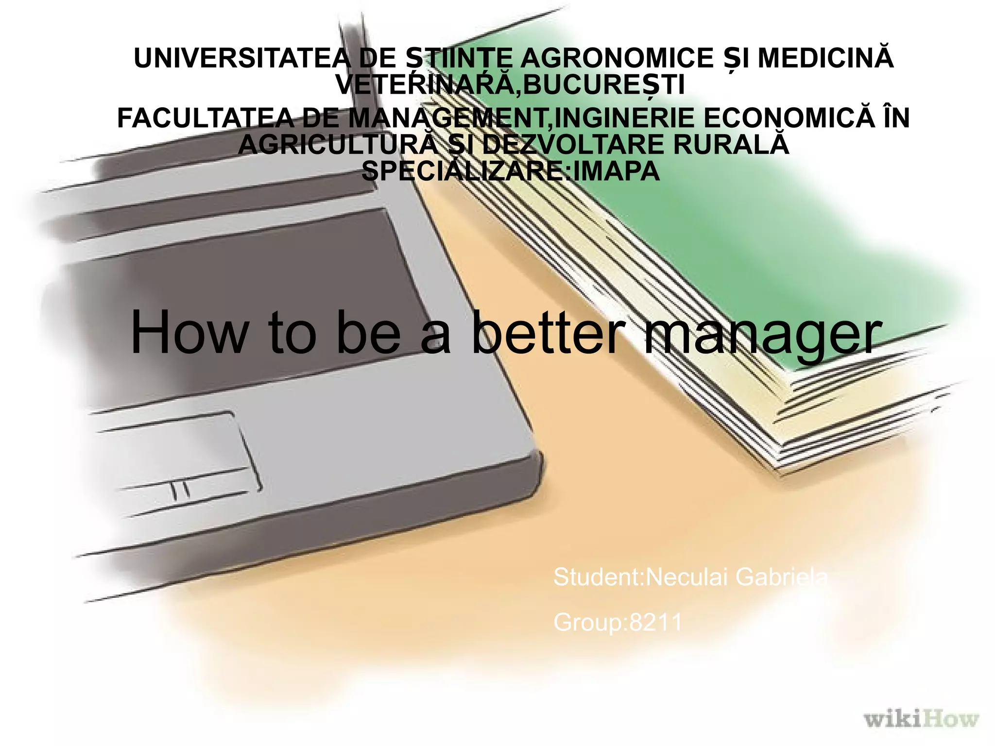 A good manager keeps the organization running smoothly by making small, effective changes. They identify employee strengths and provide positive feedback to motivate productive work. The manager clearly outlines expectations, goals, deadlines and outcomes to empower employees. They maintain an open door for questions and actively listen without dominating conversations. Asking intelligent questions demonstrates engagement and clarifies discussions.