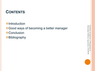 The document provides tips for becoming a better manager, including making employees feel appreciated, holding yourself to high standards, delegating tasks, acknowledging mistakes, maintaining open communication, taking interest in employees, asking questions, and treating all employees equally. The conclusion states that confidence and learning from mistakes are important, and great managers involve employees in decision making.