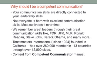 This document outlines the 10 speech projects in the Toastmasters Competent Communicator manual. The projects are designed to help speakers improve their communication skills over time through practice. They include introductory speeches, speeches with visual aids, persuasive speeches, and an inspiring conclusion speech. Each project has a goal, time limit, and provides guidance on content and delivery techniques for the speaker. Completing the projects allows speakers to develop their skills and achieve the designation of Competent Communicator.