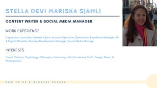 The document presents a guide on mindful reading, emphasizing the importance of paying intentional attention to reading experiences. It outlines techniques for incorporating mindfulness into reading practices, which enhance focus, self-awareness, and emotional intelligence. The emphasis is on slowing down and digesting content rather than rushing through material.