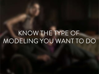 The document provides tips for aspiring models, including maintaining a healthy lifestyle, getting professional photos taken, measuring yourself accurately, searching for a local modeling agency but avoiding those that ask for money upfront, being truthful about measurements and professional on shoots, and being prepared for potential difficulties like traveling, time away from home, and initial rejections.