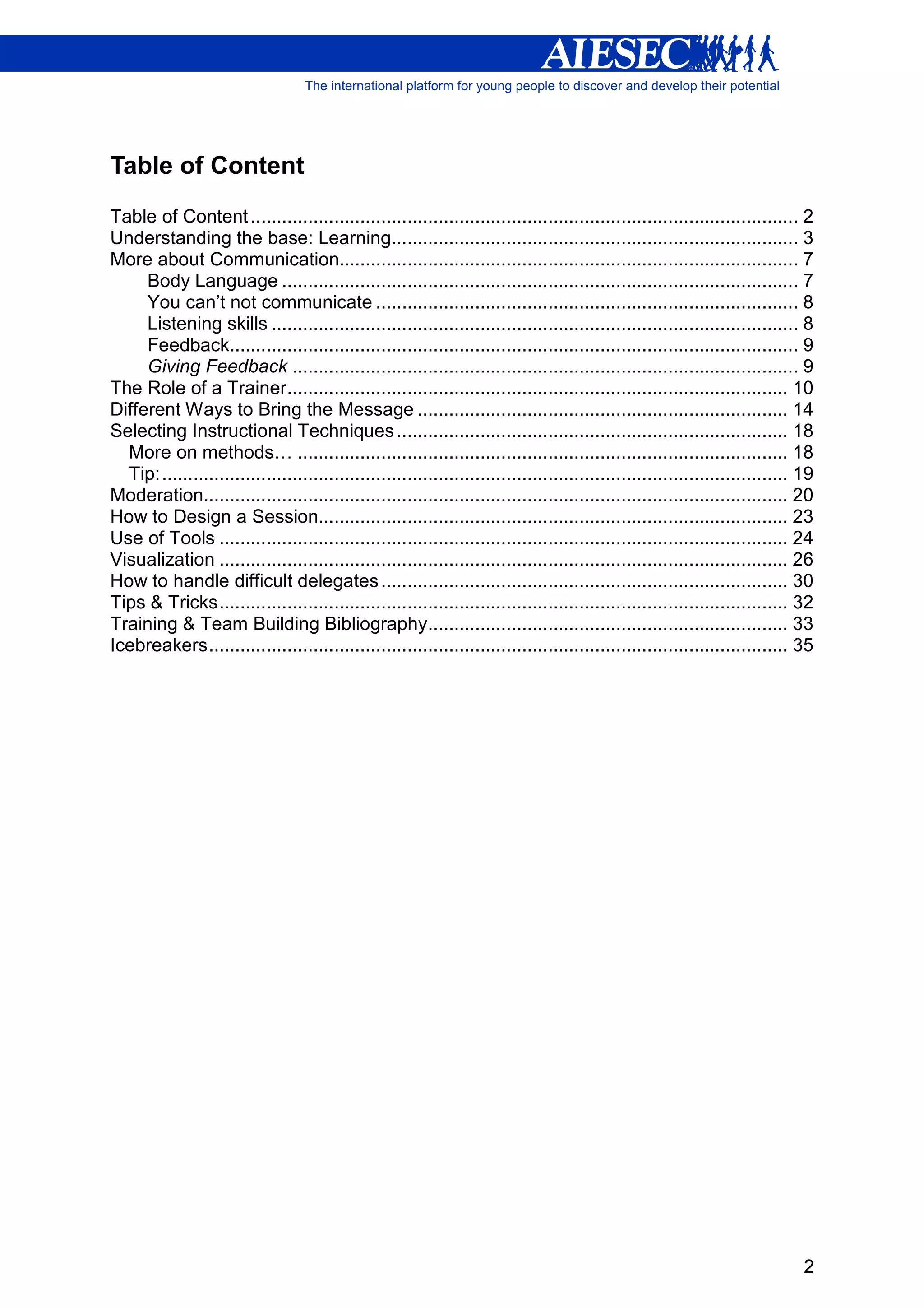 This document provides an overview of learning and communication topics for training. It discusses defining learning as an active process involving attention, information, processing, conclusions, application, and evaluation. Body language, listening skills, and feedback are important communication techniques. The role of a trainer is to facilitate learning through selecting appropriate instructional methods and tools. Designing effective sessions involves moderation, visualization, handling difficult delegates, and using tips and tricks.