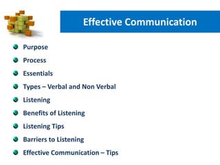 The document discusses effective communication. It covers the purpose of communication which is to understand and be understood. It also discusses the communication process which involves a sender, message, channel, receiver, and feedback. Key aspects of effective communication include knowing your subject, having clear objectives, preparation, audience analysis, delivery, and analyzing feedback. It also discusses types of communication including verbal and non-verbal, as well as listening, benefits of listening, tips for listening, and barriers to effective listening. Finally, it provides tips for effective communication and how positive and negative emotions can impact communication.