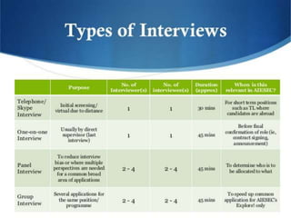 1) The document discusses how to be an effective interviewer and outlines the steps to take before, during, and after an interview.