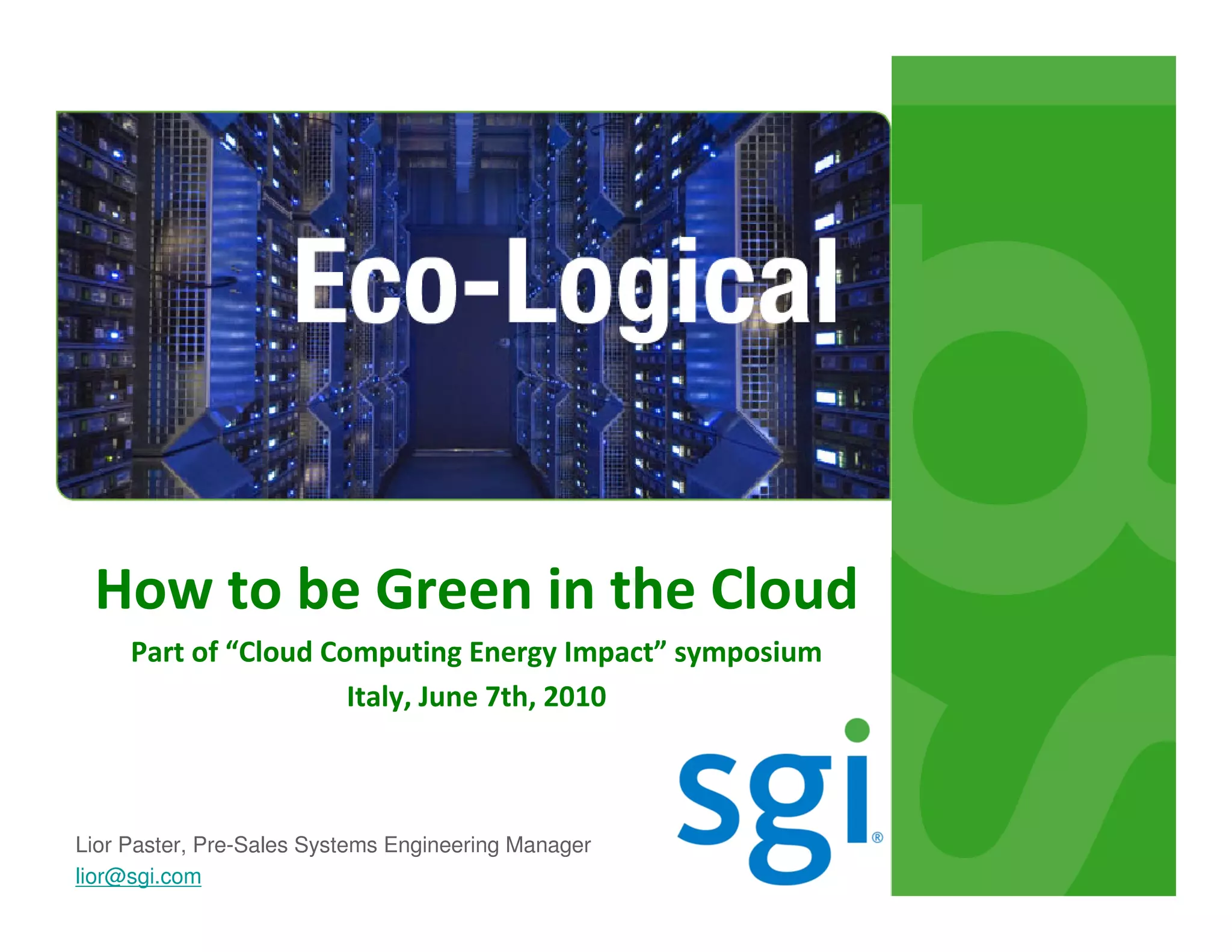 The document discusses strategies for reducing the environmental impact of cloud computing, focusing on efficient server design and energy consumption. It highlights SGI's expertise in creating scalable data centers and innovative technology solutions to optimize power and cooling. The presentation encourages the adoption of greener practices in the cloud computing industry to address the growing demand for energy.