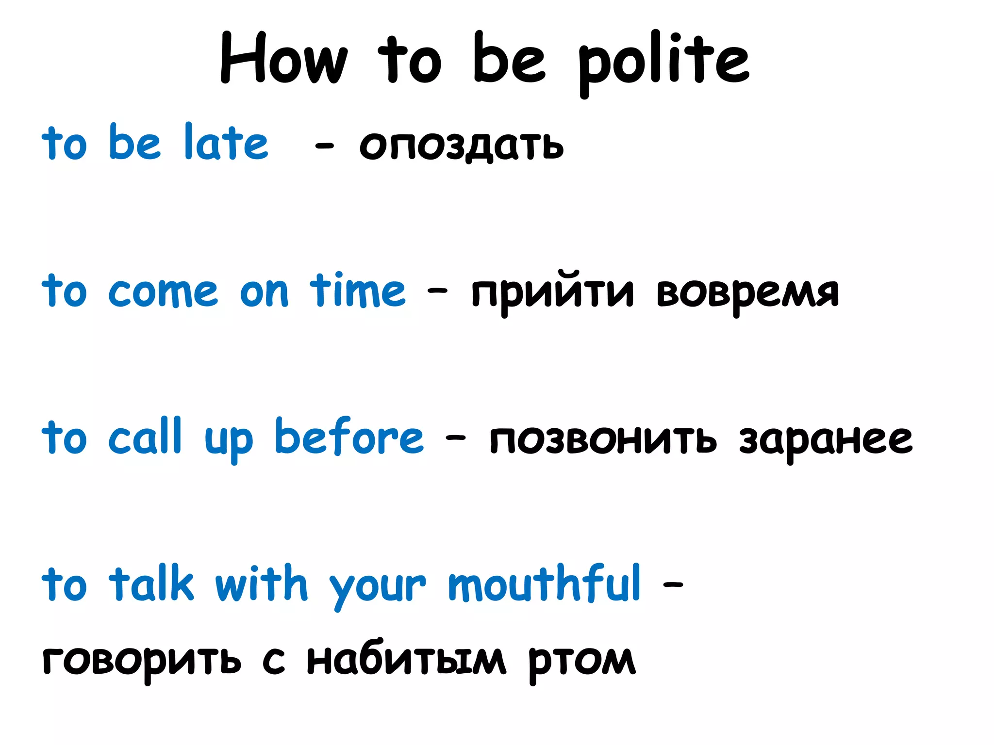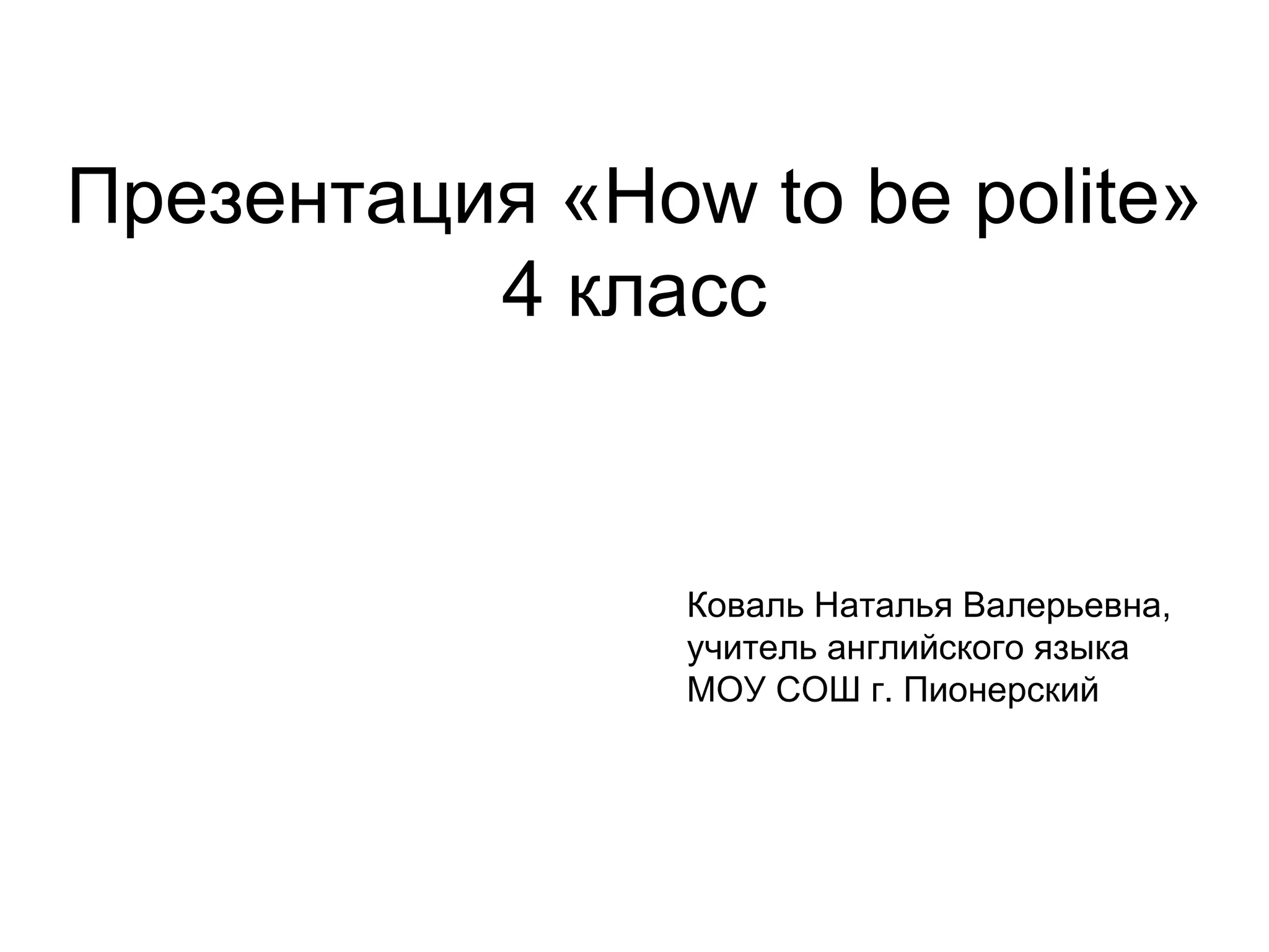 Презентация 'How to be polite' предназначена для четвероклассников и подготовлена учителем английского языка Натальей Валерьевной Коваль. В ней представлено множество вежливых фраз и ответов на них на английском и русском языках, включая приветствия, просьбы и прощания. Основное внимание уделяется правильному использованию вежливых выражений в повседневном общении.