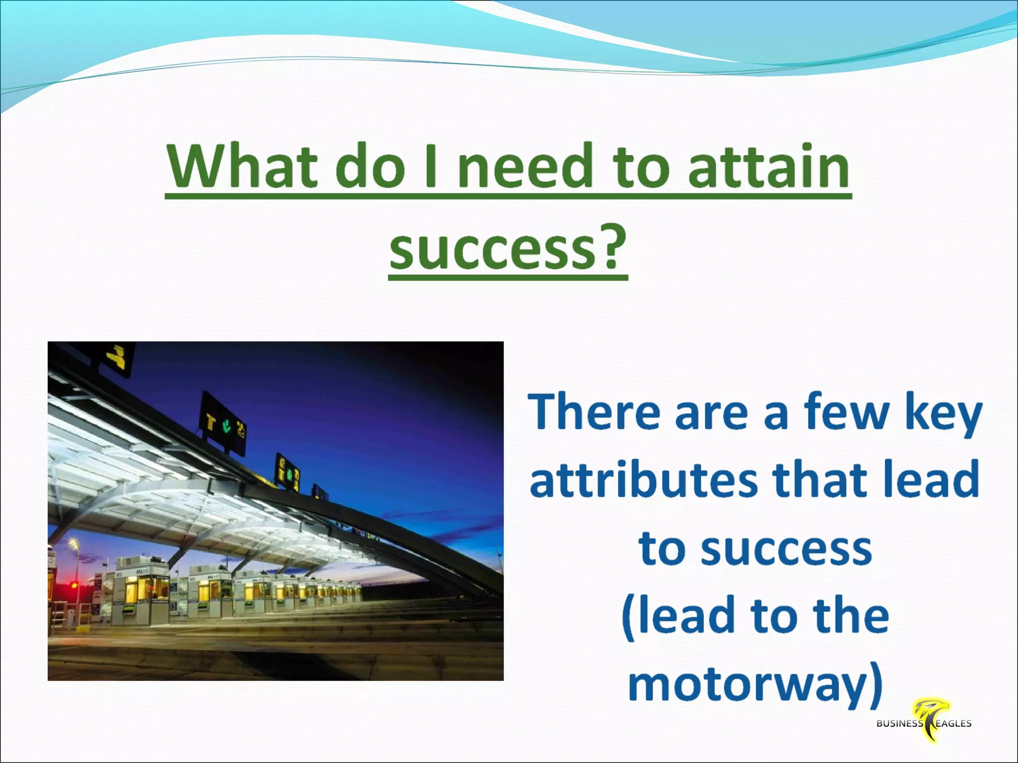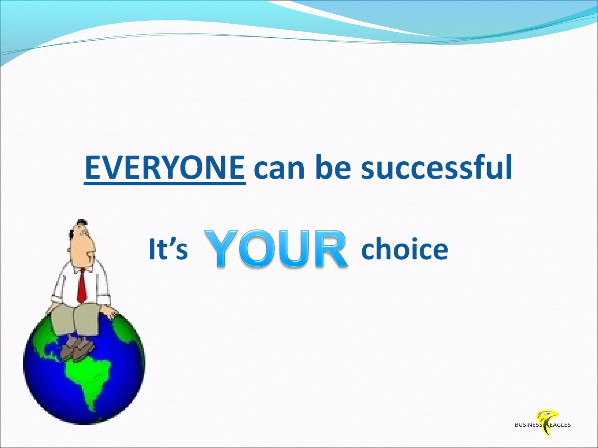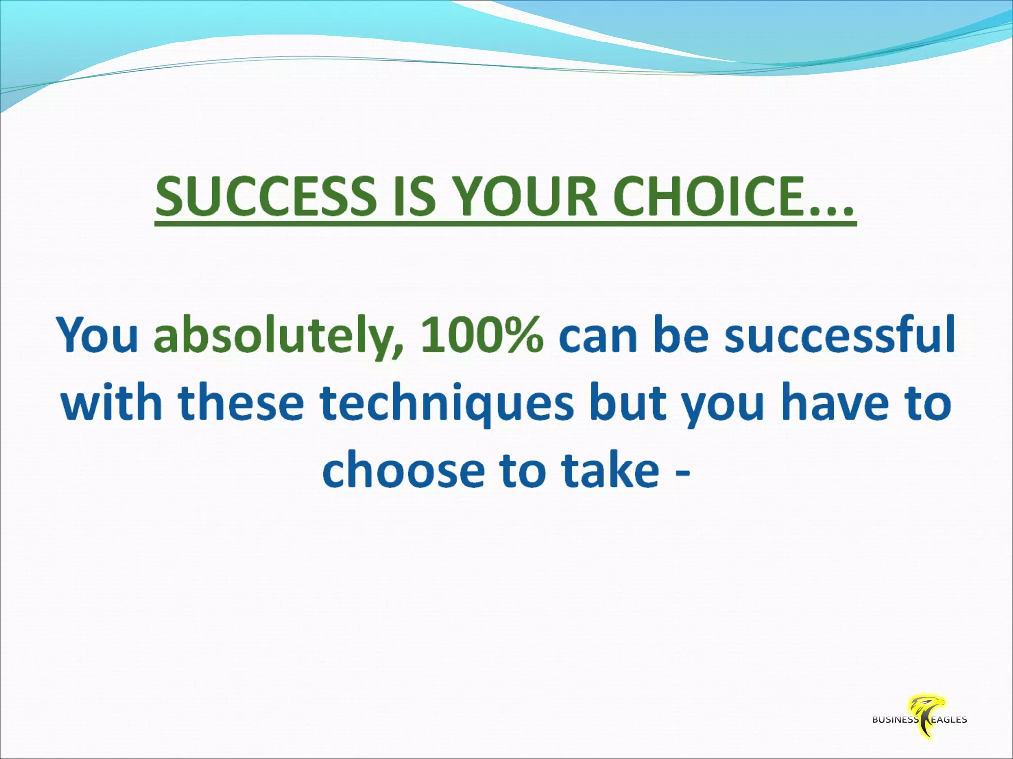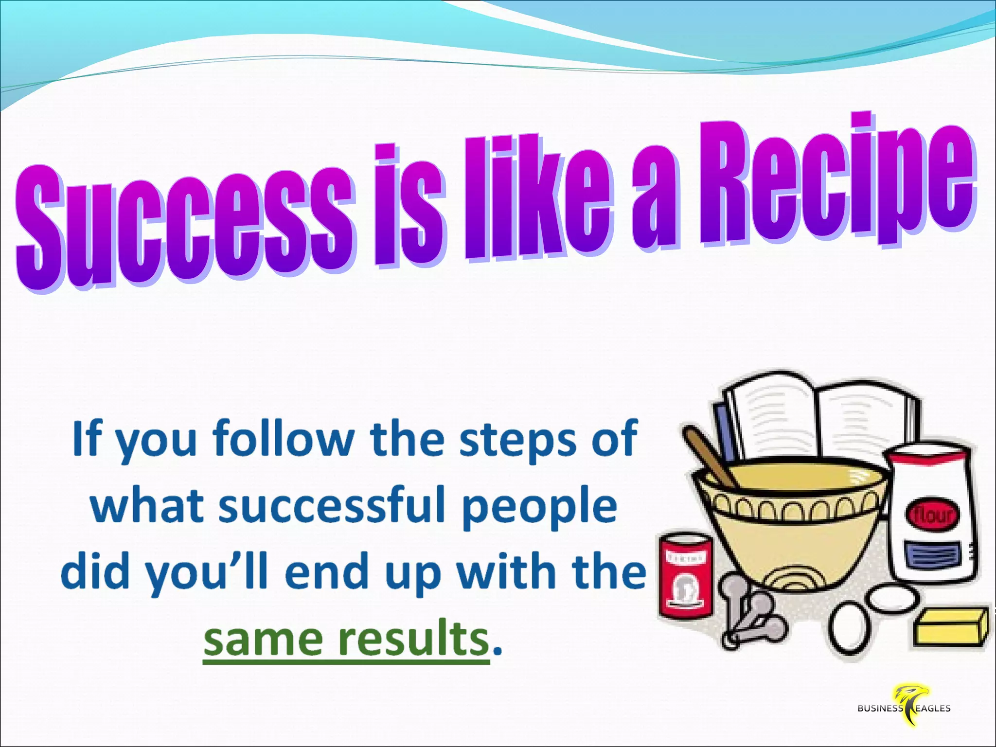 The document discusses various attributes and habits of successful people such as focusing on the most important 20% of tasks, taking responsibility for results, setting goals, believing in themselves, and being persistent and determined. It emphasizes that success requires action and hard work, and that one must take steps towards their goals every day through habits like reading, listening to audio programs, and visualizing success.