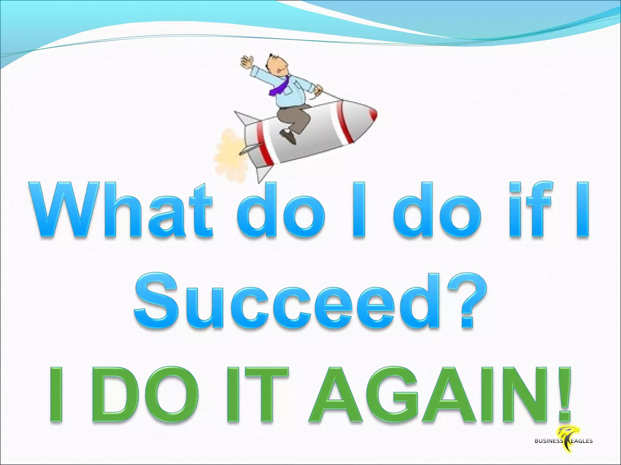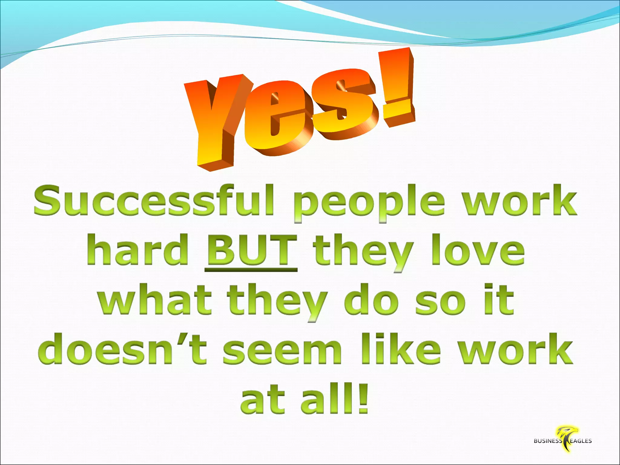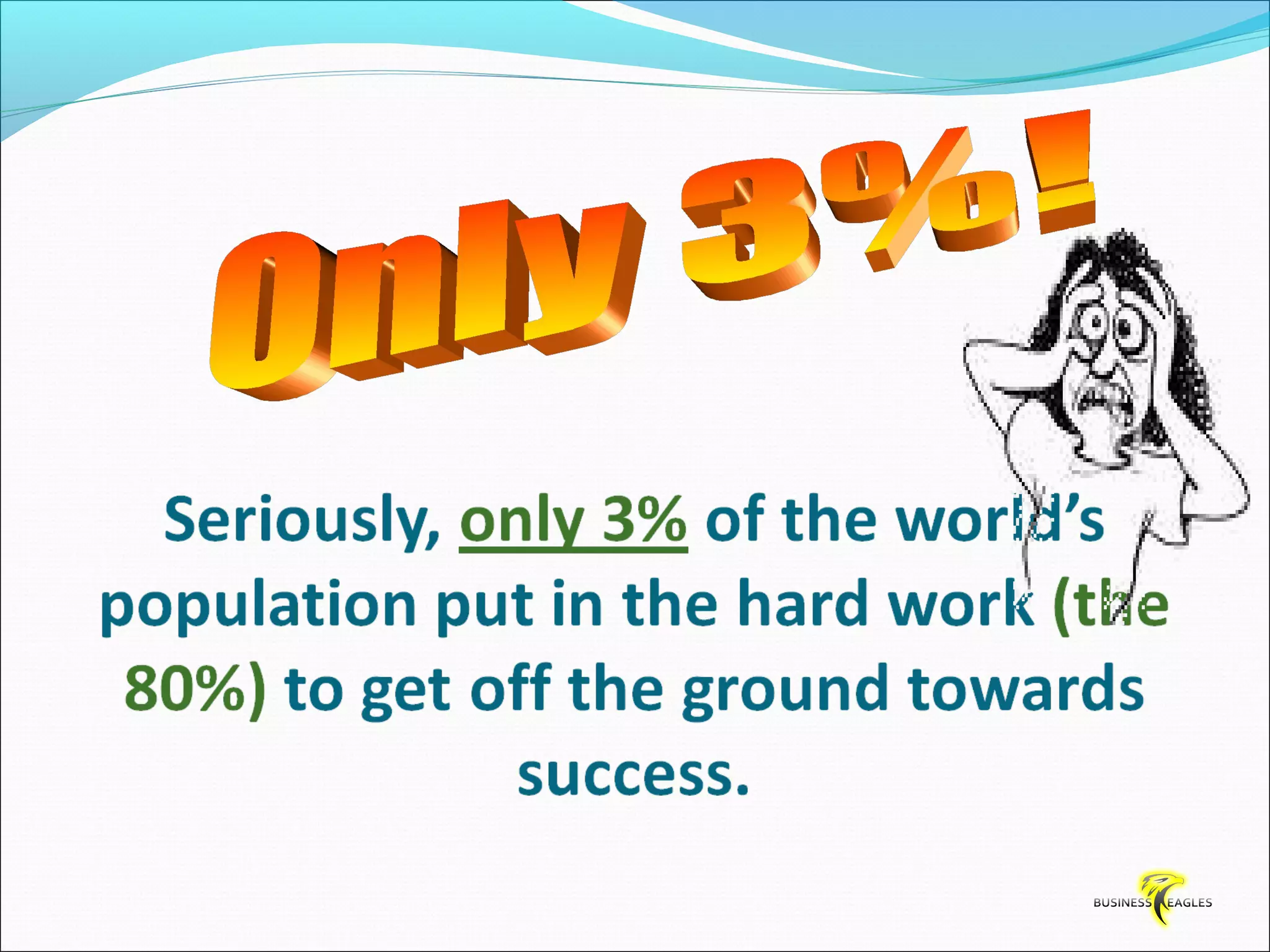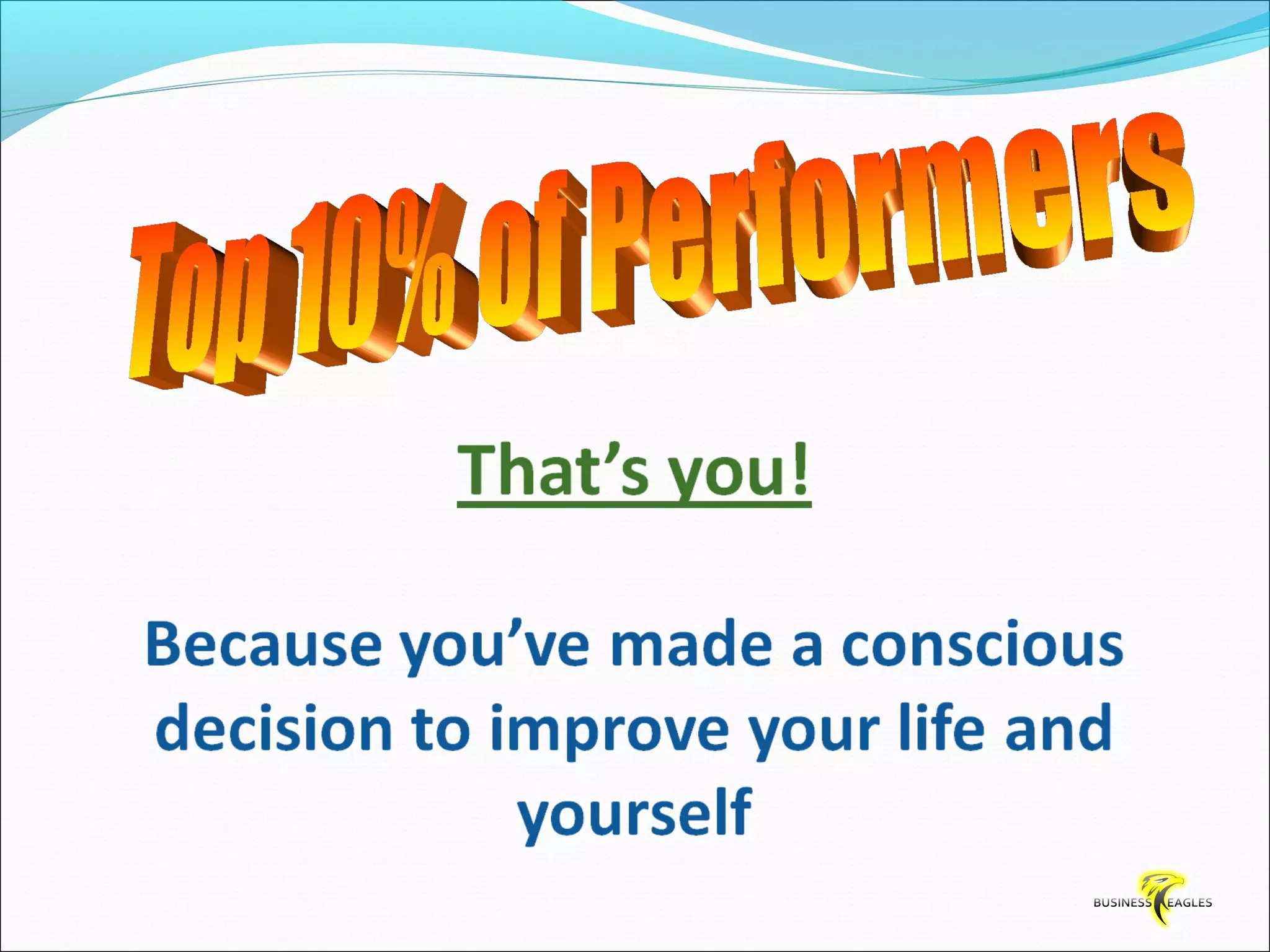 The document discusses various attributes and habits of successful people such as focusing on the most important 20% of tasks, taking responsibility for results, setting goals, believing in themselves, and being persistent and determined. It emphasizes that success requires action and hard work, and that one must take steps towards their goals every day through habits like reading, listening to audio programs, and visualizing success.