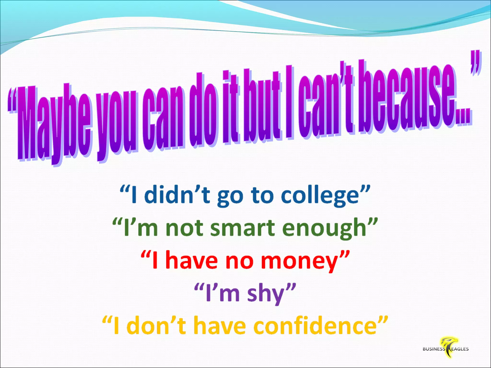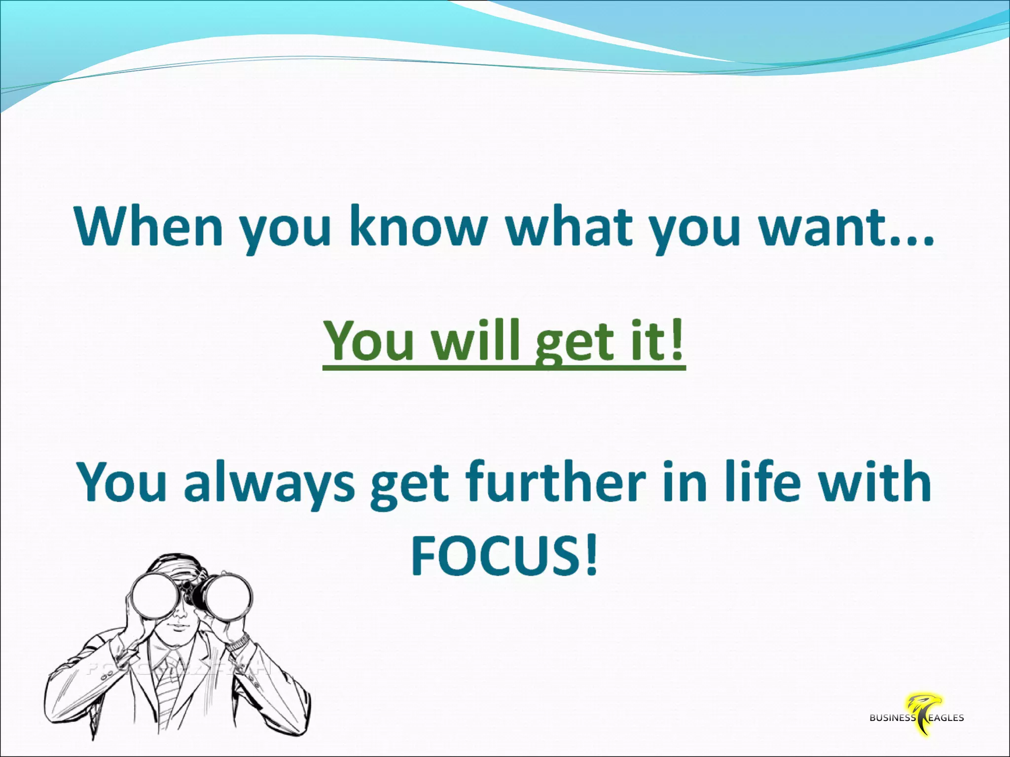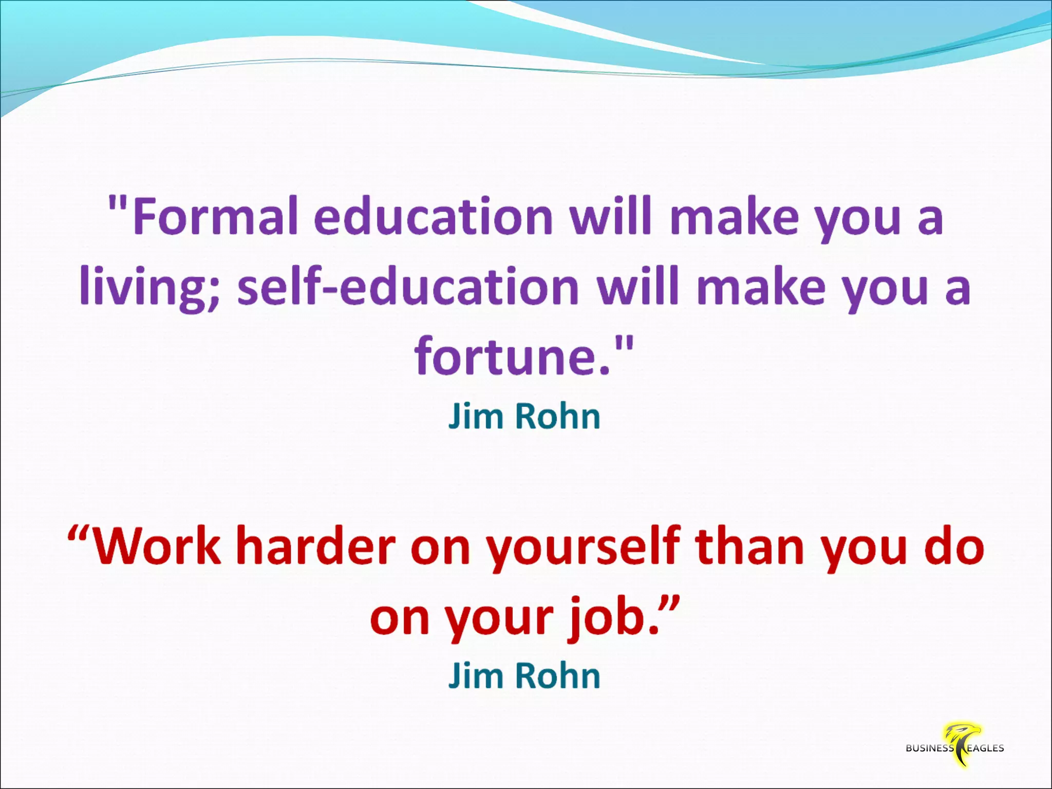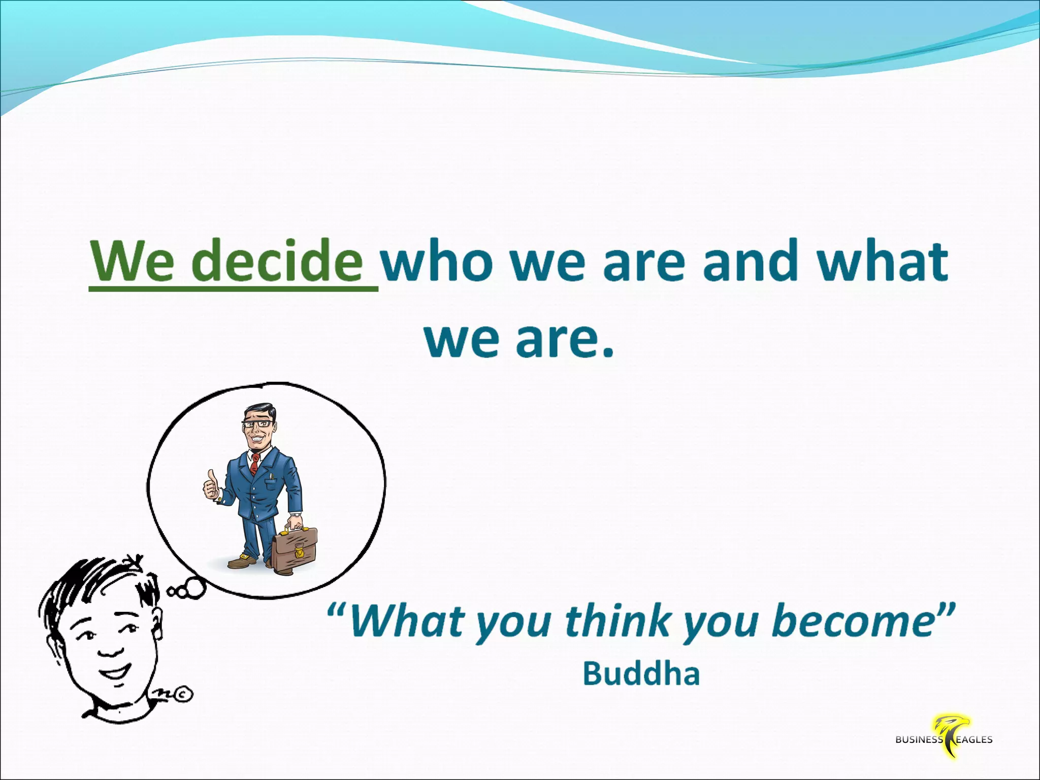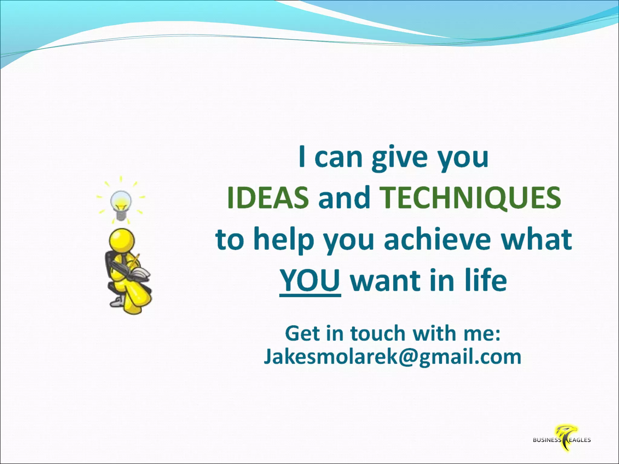 The document discusses various attributes and habits of successful people such as focusing on the most important 20% of tasks, taking responsibility for results, setting goals, believing in themselves, and being persistent and determined. It emphasizes that success requires action and hard work, and that one must take steps towards their goals every day through habits like reading, listening to audio programs, and visualizing success.