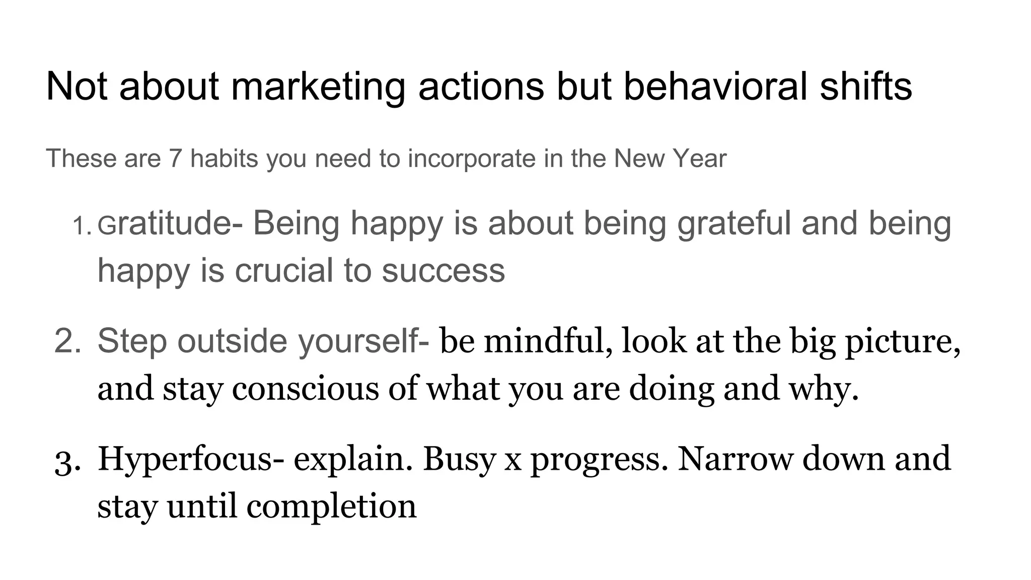 This document provides 7 habits to incorporate in 2017 to be more successful. The habits are: 1) cultivate an attitude of gratitude; 2) step outside of yourself and look at the big picture; 3) hyperfocus on one task at a time until completion; 4) have healthy doubts and question results to drive progress; 5) don't be a pleaser and develop your own voice; 6) be persistent in difficult tasks; and 7) embrace your problem-solving, quick-thinking, and opportunistic nature. Adopting these habits can lead to behavioral shifts that support success.