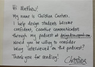 The document discusses Christina Canters interviewing Matthew Frederick, an architect, author, and educator, about creative communication. It highlights Matthew's positive response to Christina's book and their upcoming conversation on her podcast. The aim is to help individuals become confident and creative communicators through resources available at designdrawspeak.com.
