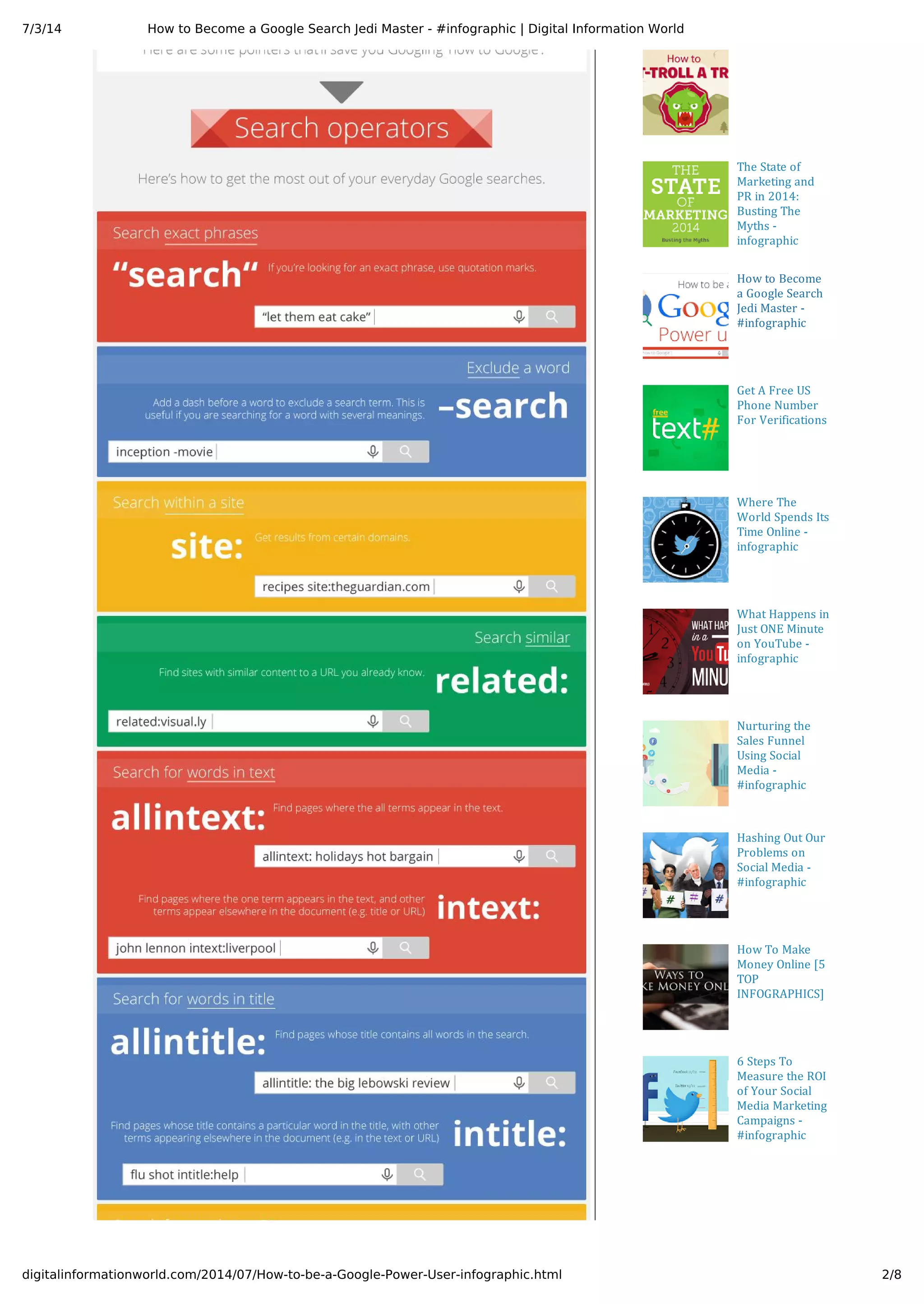 The document is an article that shares an infographic on how to become a Google search expert. It discusses advanced search techniques like using quotation marks to find exact phrases, the site: command to search specific domains, and operators like allintitle: to find pages with all words in the title. It also provides examples of special search functions and explains how images, calculators and fun searches like "do a barrel roll" can enhance Google searches. The goal is to transform Google into the most valuable research tool by learning these tips, tricks and advanced operators.