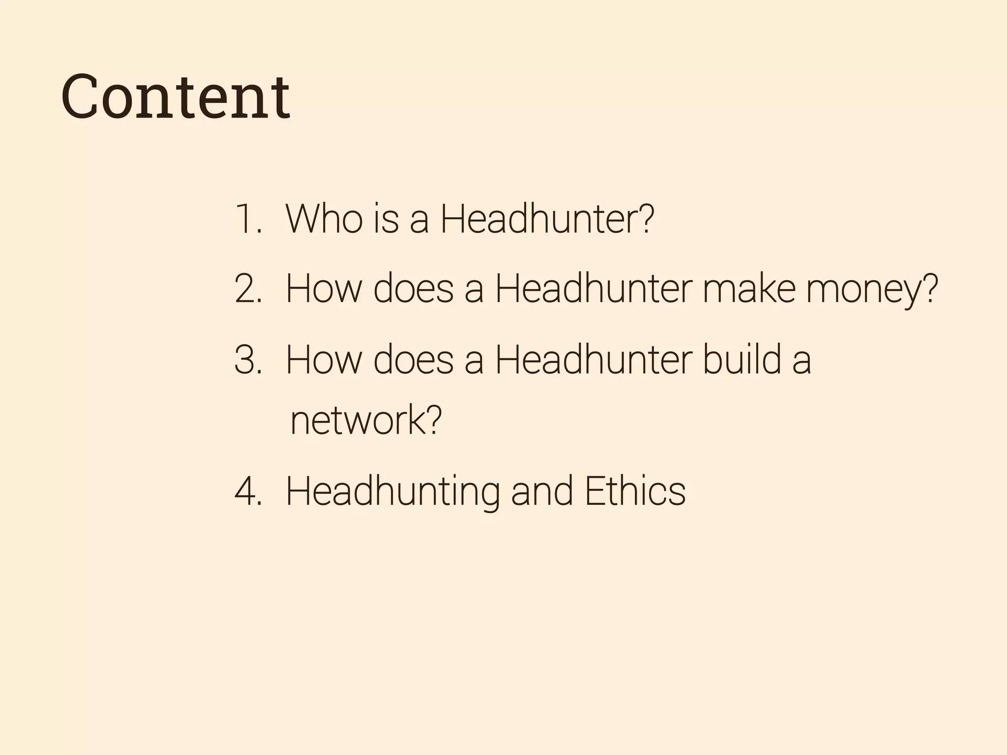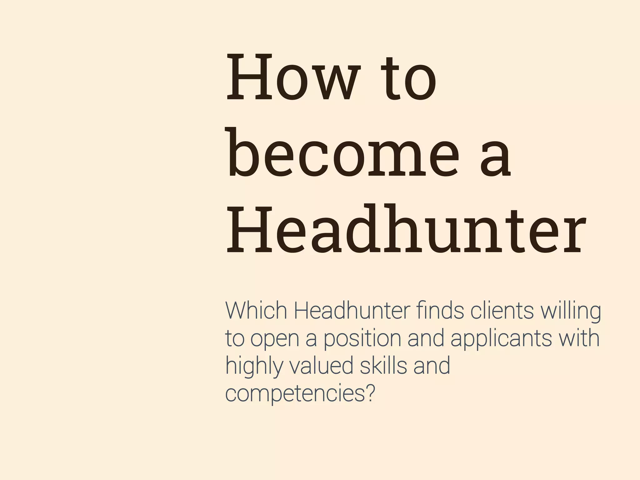 A headhunter is a recruiter who finds highly skilled employees for senior and management positions by understanding market needs and monitoring talented applicants. They connect hiring clients' requirements to candidates' skills through their large professional networks of companies and individuals built on trust and visibility. Headhunters must build independent networks of corporate clients and potential candidates through conferences, publishing articles, and providing guidance while maintaining strong ethics.