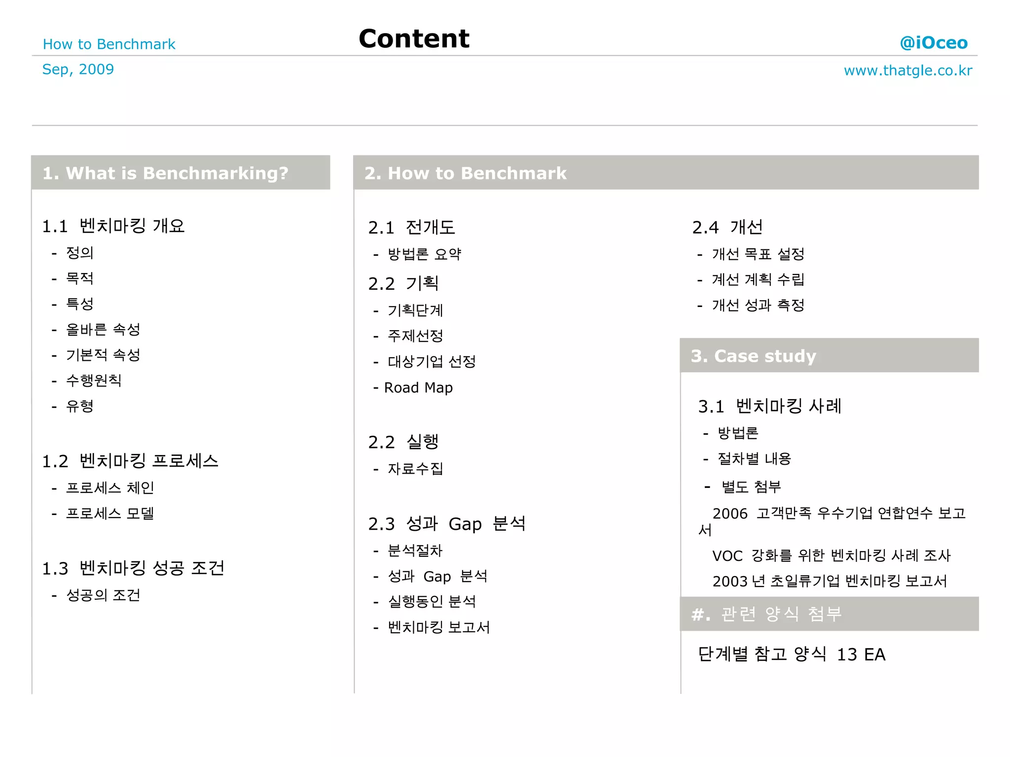 How to Benchmark2 2.1 전개도 2.2 기획 2.3 실행 2.4 성과 Gap 분석 2.5 개선 www.thatgle.co.kr @iOceo