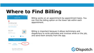 The document provides instructions on how to bill and invoice customers using the Dispatch app, including how to find and create estimates and invoices from within appointments, how to add line items and totals to estimates and invoices, and how to send estimates and invoices to customers via email or signature. Technicians and dispatchers can create estimates to provide customers cost quotes and invoices to bill for completed work directly from the app while in the field. The document also provides contact information for getting help with billing and invoicing in Dispatch.