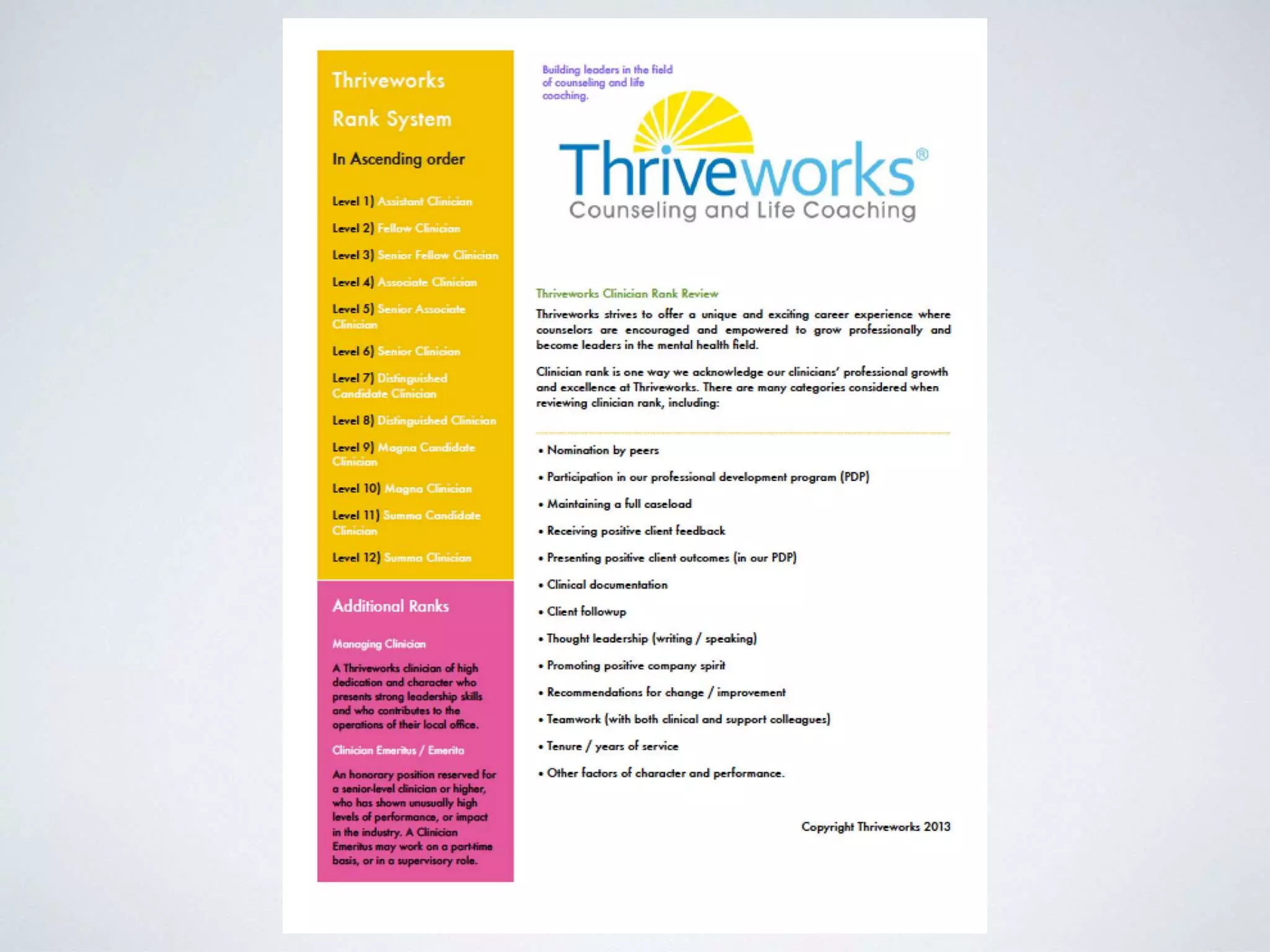 The document discusses the complexities and potential earnings of running a counseling practice, highlighting the pros and cons of entrepreneurship in this field. It outlines the costs associated with operations, the importance of building value in a practice, and offers insights into essential factors for success, such as clinical experience and marketing strategies. Additionally, it emphasizes the significance of team culture and staff management in retaining quality clinicians.