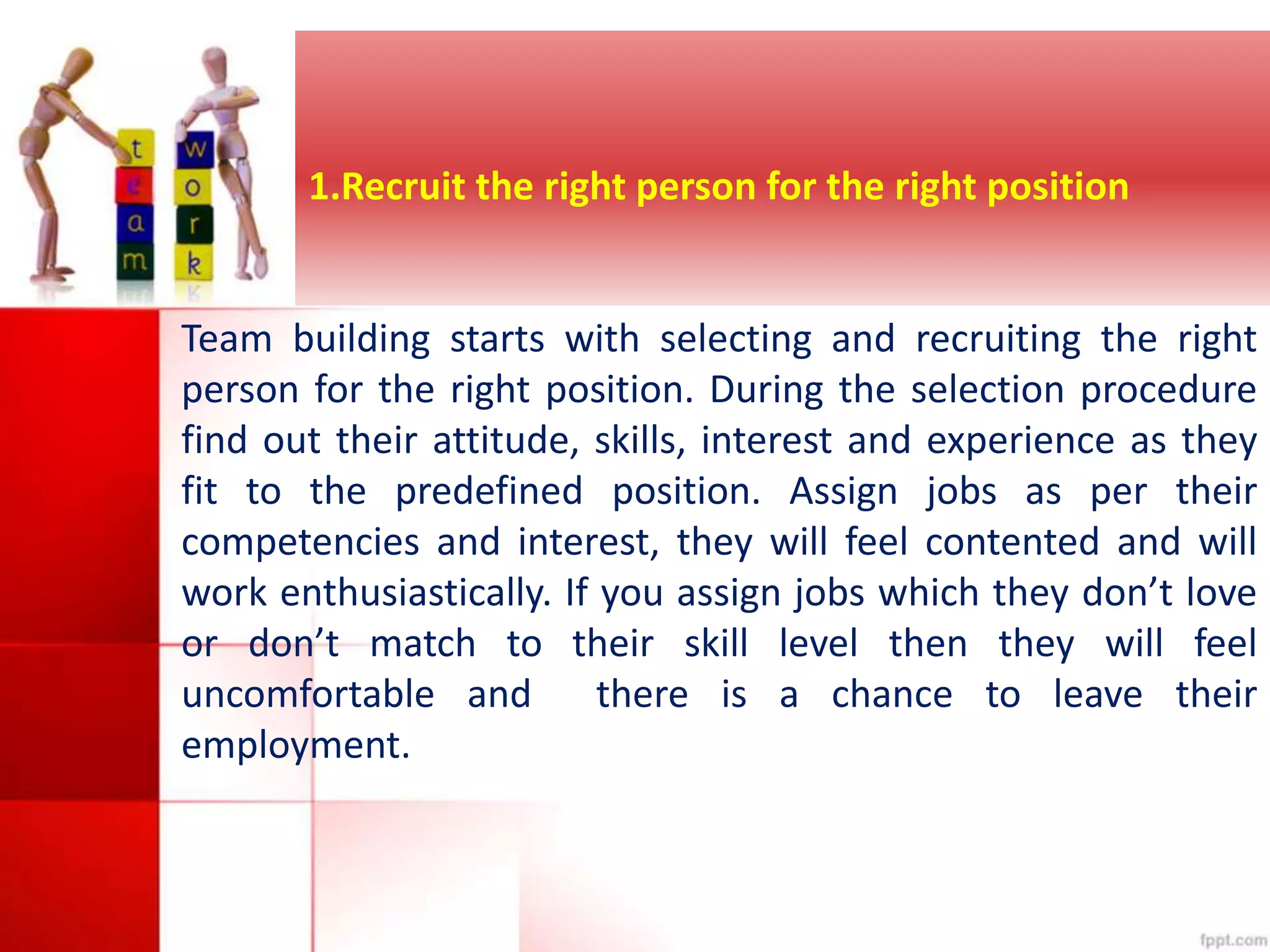 The document outlines 11 steps to building a successful team: 1) recruit the right people for the right jobs, 2) set clear and challenging goals for the team, 3) clearly define each member's responsibilities, 4) take initiatives to improve members' capabilities, 5) create a congenial working environment, 6) resolve conflicts effectively, 7) encourage social gatherings outside of work, 8) celebrate successes, 9) don't allow poor performers to remain on the team, 10) retain good employees, and 11) be aware of "team destroyers" and their negative attitudes. The overall message is that establishing the right team composition and culture through clear expectations, training, appreciation, and conflict management is key to a successful team