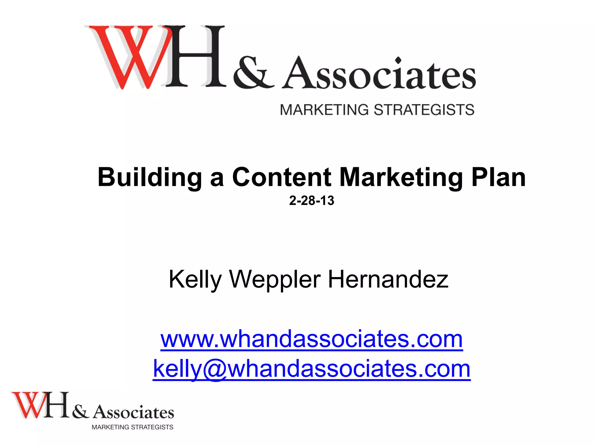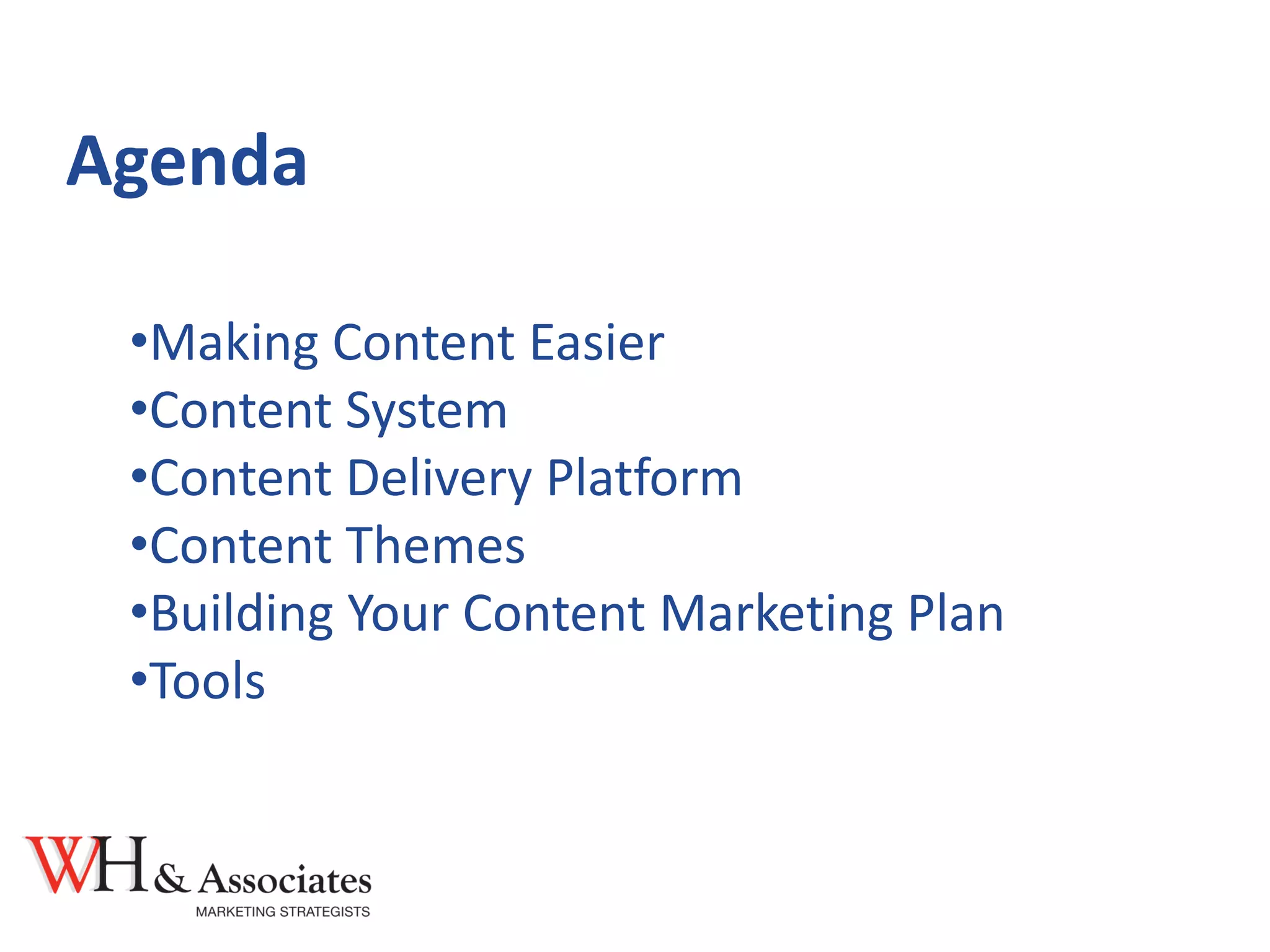 The document outlines steps for building an effective content marketing plan. It recommends identifying monthly content themes that relate to your business objectives and developing a content delivery system. The plan should include blogs, newsletters, webinars and other content types. When selecting themes, consider topics that can grow parts of your business or are relevant to customers. The document also provides tips for filling content gaps and tools to help curate material from other sources.