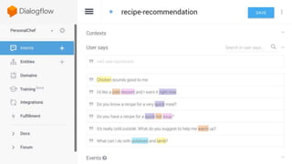 This document discusses building actions for Google Assistant using Dialogflow. It covers setting up a Dialogflow agent project, training the agent with sample conversations, defining intents and parameters, configuring responses, adding fulfillment logic, and integrating the agent with other services like Line. The document also provides instructions for deploying the Dialogflow agent to Firebase Functions and includes some tips for getting started with building agents.