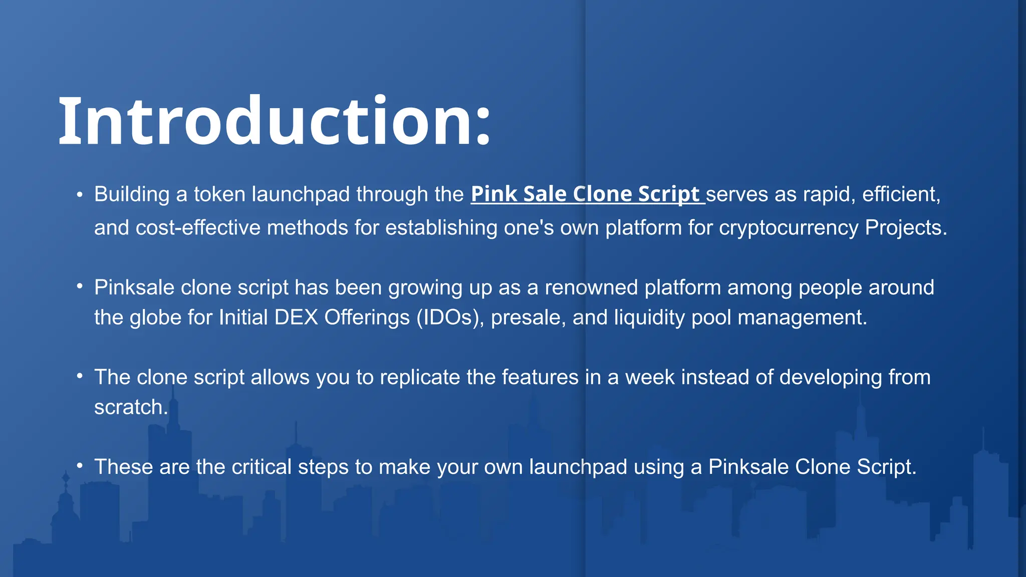 The document outlines steps to build a cryptocurrency launchpad using a pinksale clone script, emphasizing the importance of defining requirements, choosing a reliable development partner, and customizing the platform. It guides readers through essential stages including security feature implementation, multi-chain support, and marketing strategies. The conclusion highlights that using this approach enables the creation of a secure and scalable token sale platform, enhancing the user's experience in the cryptocurrency fundraising space.